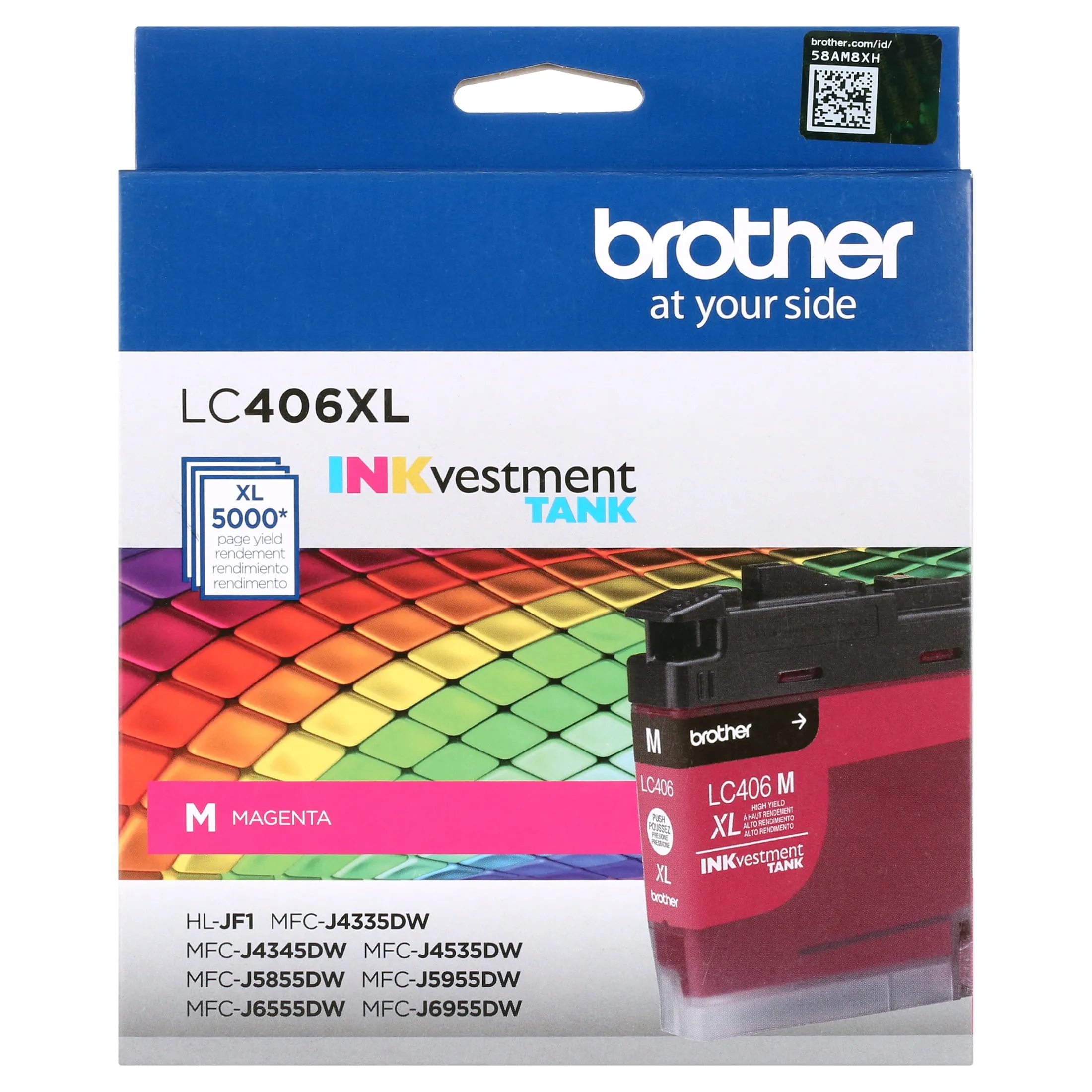 Always trust Brother Genuine ink for superior inkjet print quality and performance you can consistently rely on. Brother Genuine LC406XLM High Yield Magenta INKvestment Tank Ink Cartridges deliver consistent, professional results and ultra convenience with an up to 5,000-page yield (All page yields are approximate and are calculated in accordance with ISO/IEC 24711; for additional page yield info, see www.brother.com/pageyield). All Brother Genuine INKvestment Tank ink cartridges are intelligently engineered to work seamlessly with your Brother INKvestment Tank inkjet printer for consistent, reliable results. Brother Genuine LC406XLM is for use with the following Brother INKvestment Tank all-in-one color printers: MFC-J4335DW, MFC-J4335DW XL, MFC-J4345DW XL, MFC-J4535DW and MFC-J4535DW XL.