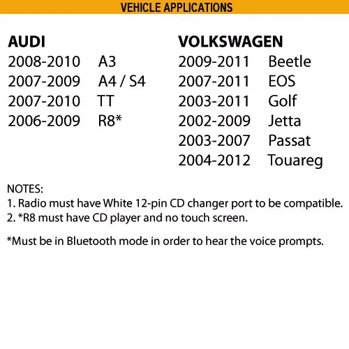 Adds Bluetooth Music streaming to the OEM Volkswagen and Audi radios; USB music playback with track up, track down and folder controls from the radio panel or steering wheel controls; Adds 3.5mm auxiliary audio input; Hear turn-by-turn Navigation App Voice Prompts on your car audio system while in Bluetooth mode; Magnetic phone mount included