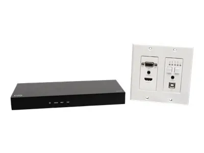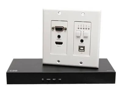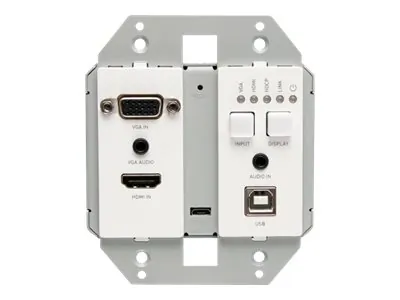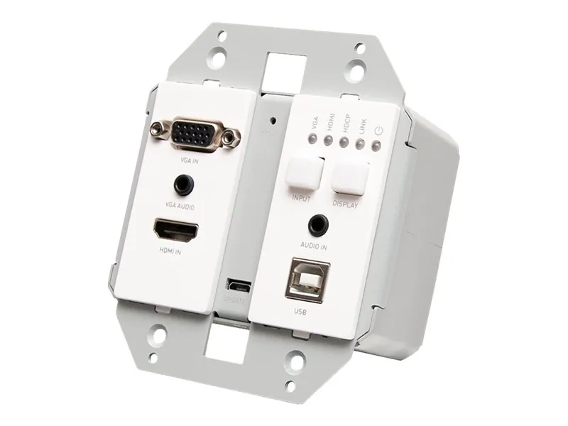 The HDBaseT HDMI VGA USB Wall Plate provides seamless connectivity for a variety of audio and video sources. This wall plate allows users to easily connect HDMI, VGA, and USB devices to a central receiving unit, making it ideal for conference rooms, classrooms, and home theaters.