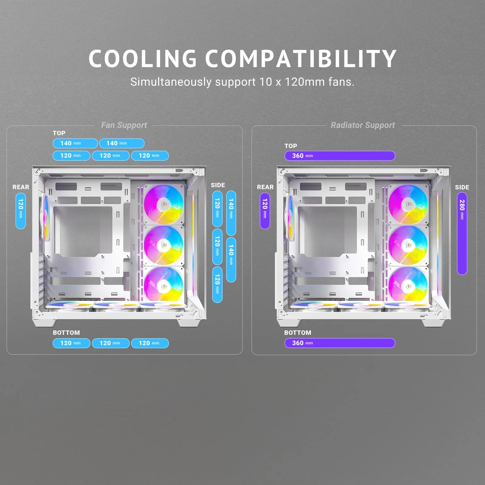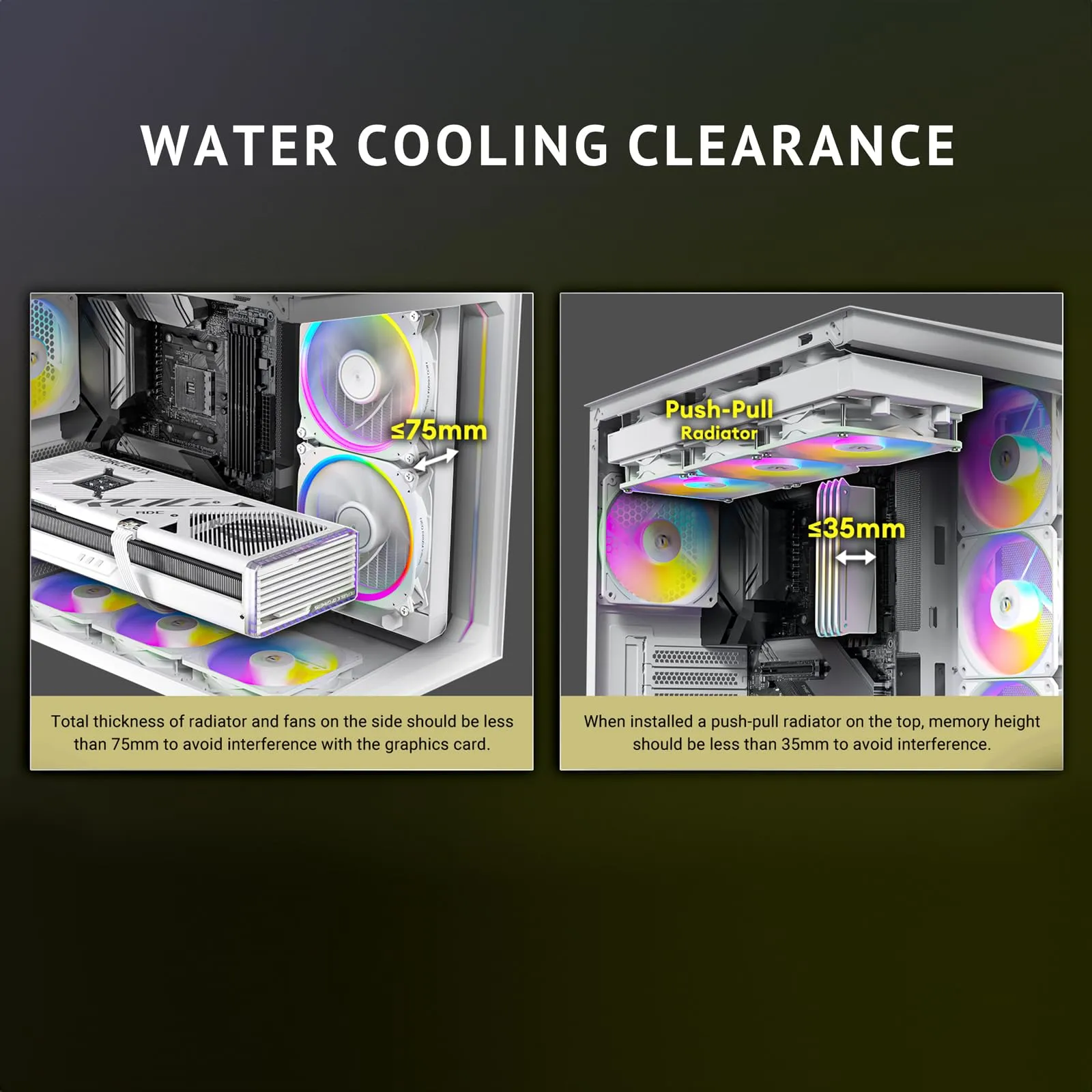 Featuring customizable ARGB lighting, you can easily set the mood for your gaming environment. The spacious interior accommodates various hardware configurations, including ample room for GPU and cooling components.