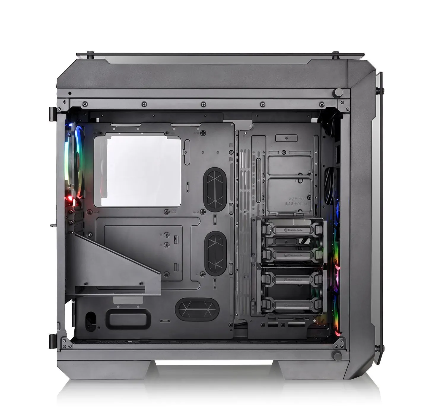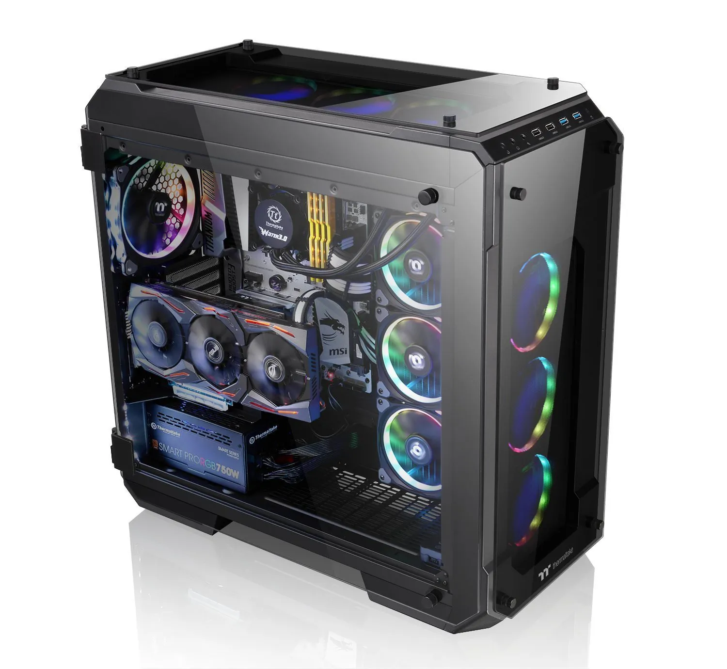 Designed to expand the legacy of the View Series lineup, the View 71 Tempered Glass RGB Edition Full Tower Chassis features unrivaled cooling support and expandability surrounded in tempered glass for a one of a kind view. Swing open full window tempered glass panels for easy access with all panels properly spaced for optimal airflow. Preinstalled with three 140mm Riing RGB fans, Vertical GPU mount and 3-Way radiator support for today?s PC hardware demands, the only limitation is your imagination.