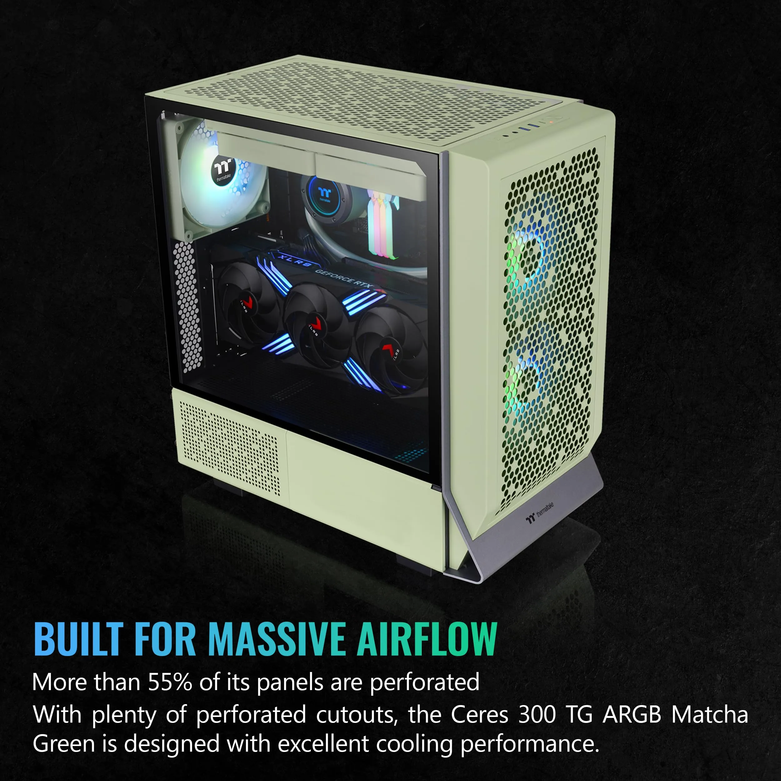 The Thermaltake Ceres 300 Matcha Green E-ATX Mid Tower Computer Case is crafted for gamers and PC builders who demand style and functionality. Its vibrant matcha green color adds a refreshing touch to any setup, while the spacious interior supports E-ATX motherboards and offers abundant room for high-performance components.
