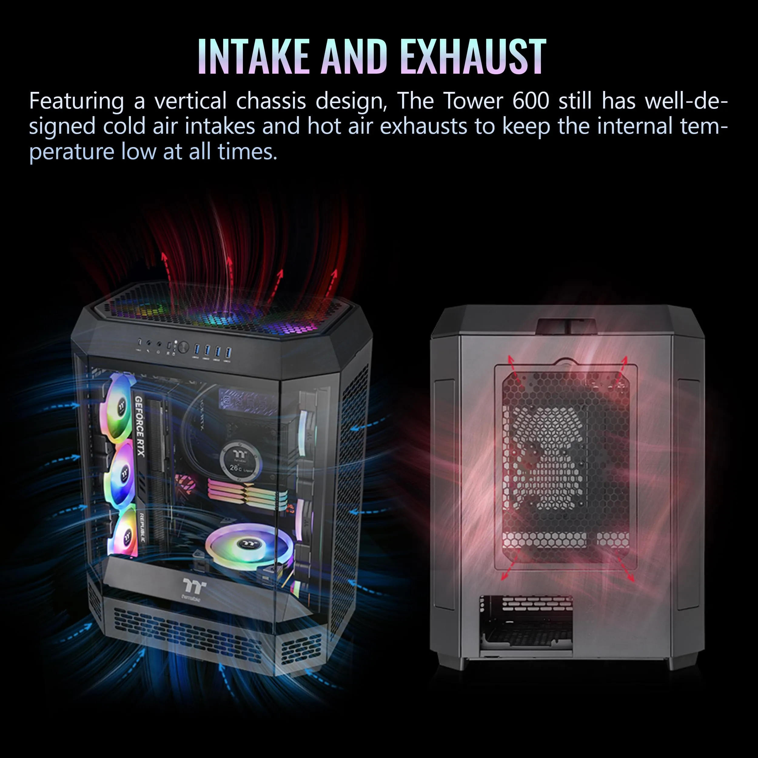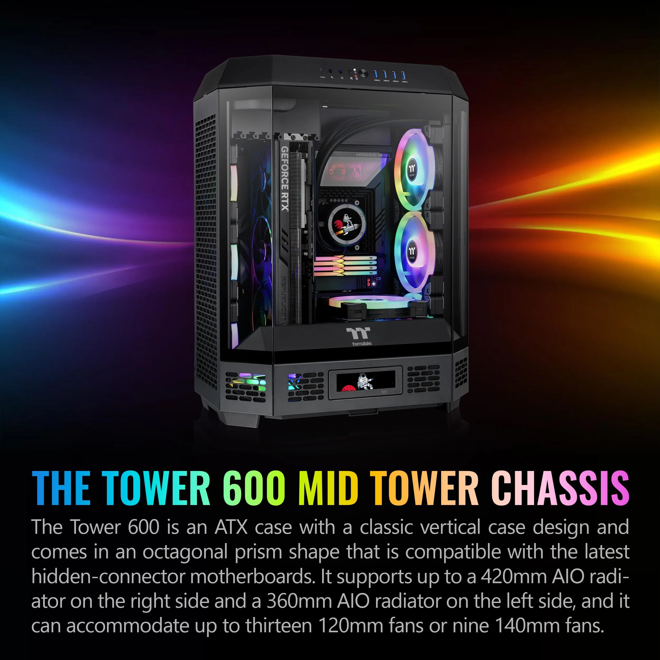 The Tower 600 Mid-Tower ATX case showcases an innovative vertical interior layout with a striking octagonal design, part of the renowned Tower series. It supports motherboards with hidden connectors, accommodating radiators up to 420mm, and provides ample space for premium cooling solutions. Experience tool-free access to three tempered glass panels and rotational PCI-e slots for vertical GPU mounting, making the Tower 600 a perfect blend of performance and aesthetic appeal. Available in a variety of colors including Black, Snow, Matcha Green, and Hydrangea Blue.