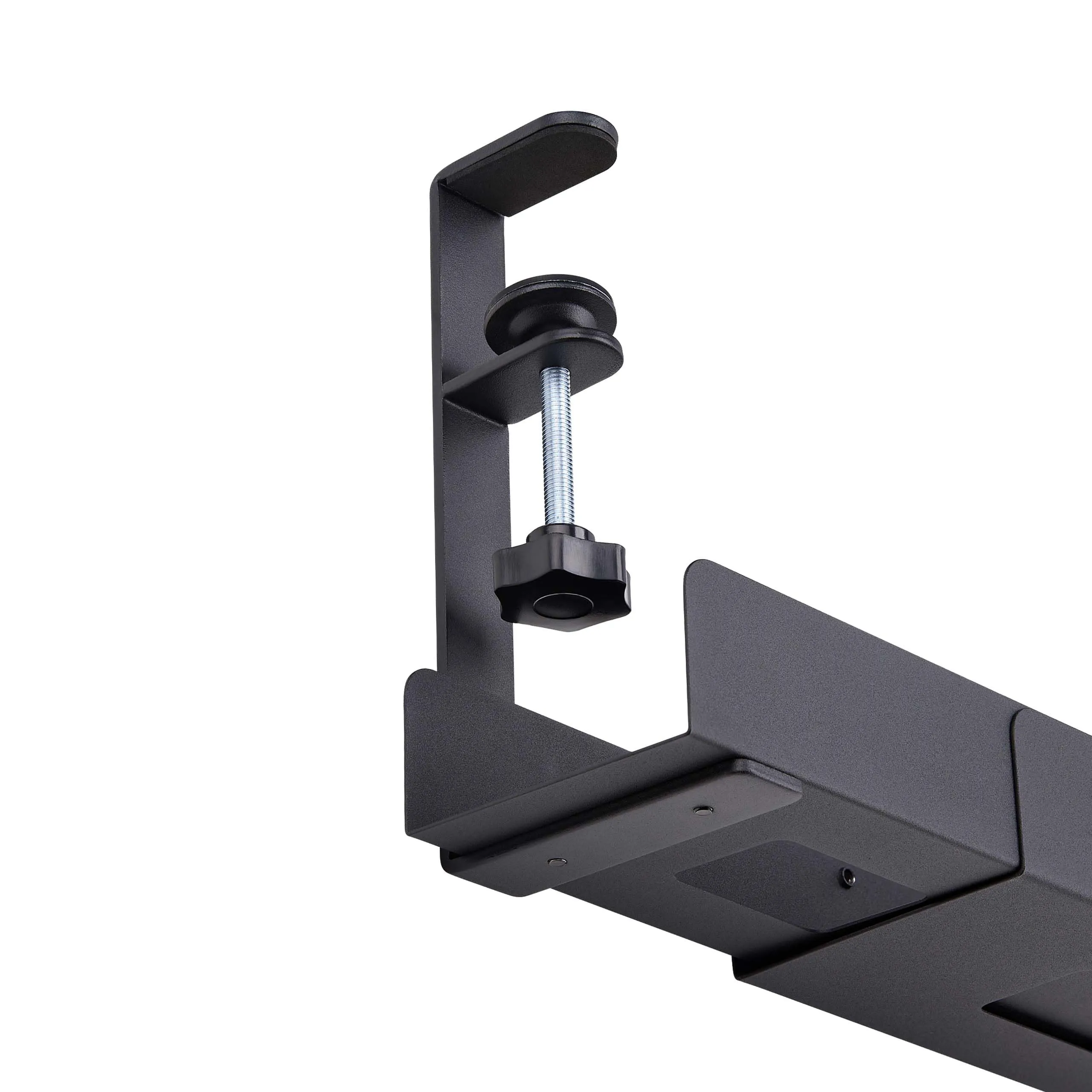 Organize workspaces to reduce risk of tripping hazards or tangled cords; Extra-large tray and headspace fits larger power bars/strips- Under desk cable management tray is length adjustable (2.6ft/3.3ft/3.9ft 0.8m/1m/1.2m); Hardware incl. for installation/adjustment - Tool-free setup w/no drilling required; Foam padding and rubber on the clamp protects desk surface - Powder-coated steel; ISTA-6 cert. package - Works with wood/glass/metal desks up to 2in (50mm) thick; Cable Management Slots.