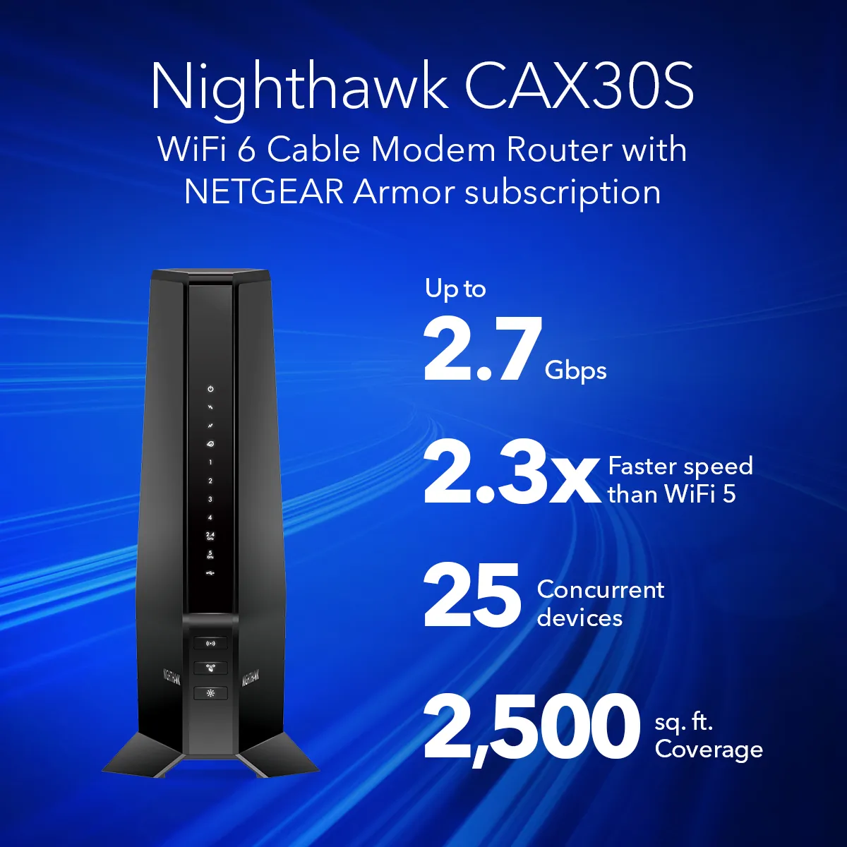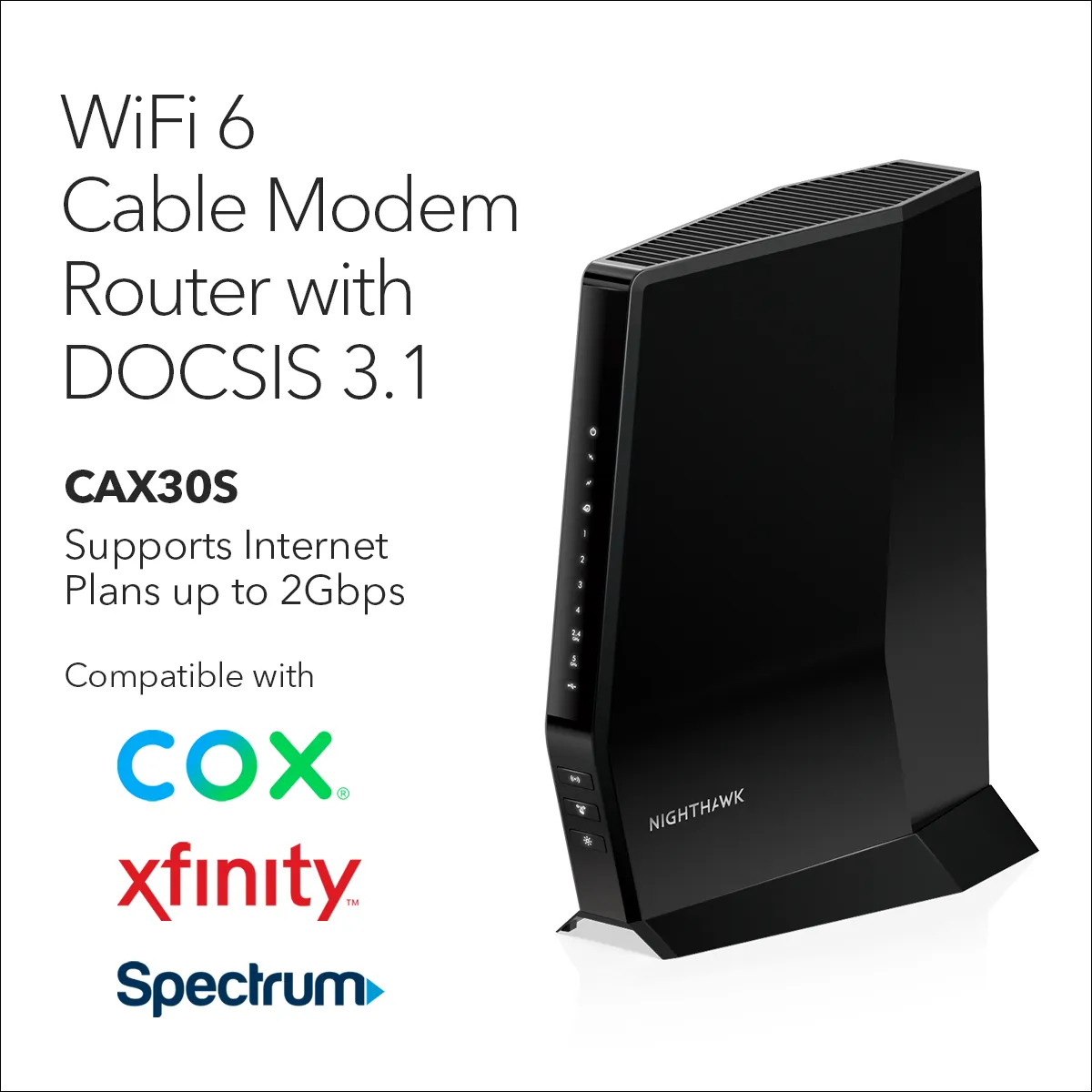The Netgear Nighthawk AX6 Cable Modem and Wireless Router is designed to provide superior speed and performance for your home network. With the latest Wi-Fi 6 technology, it supports multiple devices with ease, offering faster download speeds and improved connectivity.