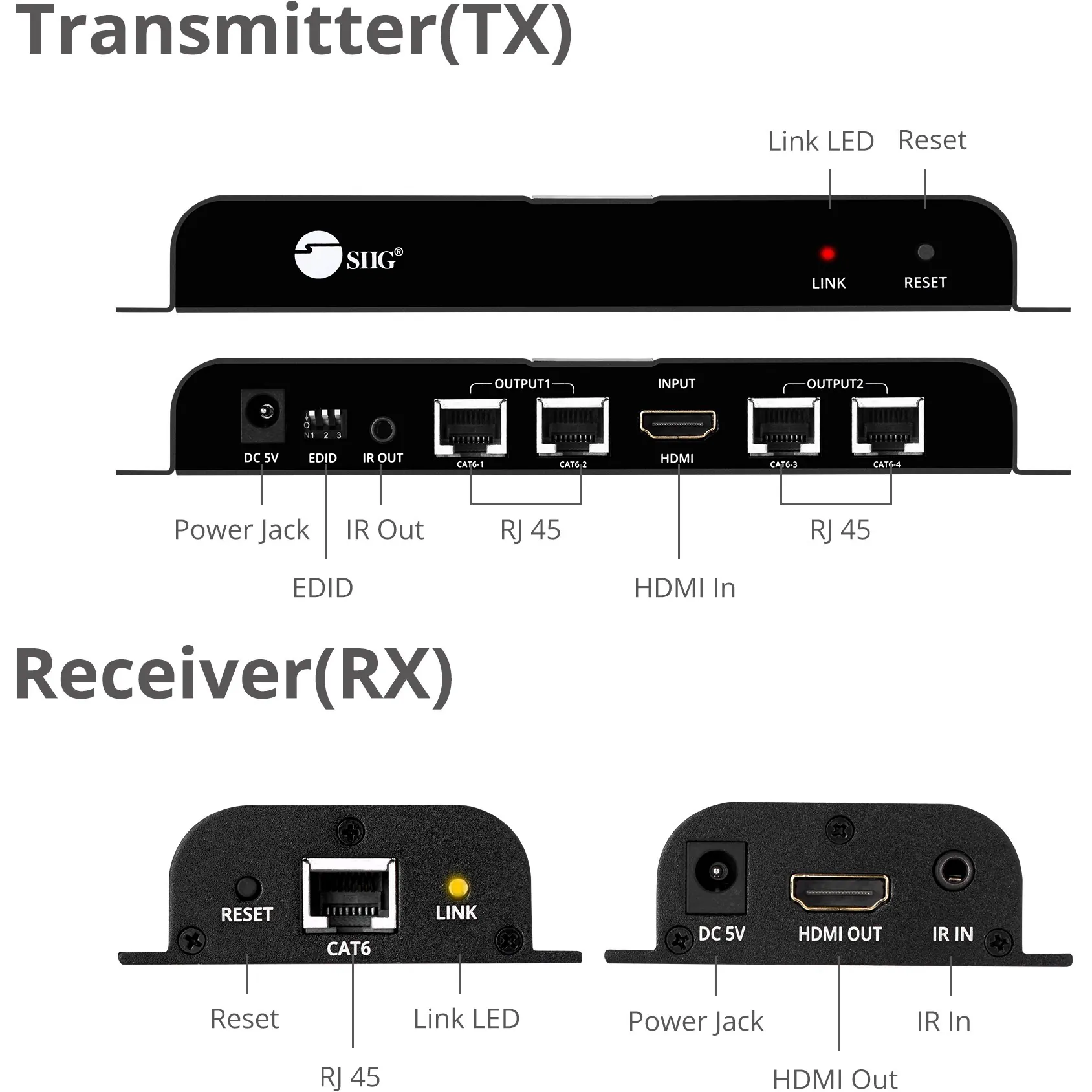 General InformationExtends HDMI signals to four HDMI displays over single Cat6 cable up to 130 feet (40 meters) Extends HDMI signals up to 130ft (40m) over economical Cat6 cabling to up to 4 displays Delivers crystal clear Full HD content up to 1080p@60Hz resolution IR remote control through Cat6 cable allows you to control the HDMI source device at the remote display location High quality durable metal housing with ventilation panels provides excellent heat dissipation to ensure reliable performance and system stability during long hours of operation Plug-n-Play installation, no software installation required Technical InformationConnectivity Technology: WiredNumber of Input Devices Supported: 1Number of Output Devices Supported: 4Maximum Operating Distance: 131.23 ftVideoGraphics Modes: Full HDMaximum Video Resolution: 1920 x 1080Interfaces/PortsNetwork (RJ-45): YesHDMI In: YesHDMI Out: YesNumber of Network (RJ-45) Ports: 8Number of HDMI Inputs: 1Number of HDMI Outputs: 4Media & PerformanceMedia Type Supported: Twisted PairTwisted Pair Cable Standard: Category 7MiscellaneousPackage Contents: 1 x Transmitter 4 x Receiver 5 x Power Adapter 1 x IR Blaster Extension Cable 4 x IR Receiver Extension Cable Screw Kit User Reference Guide Environmentally Friendly: YesEnvironmental Certification: RoHSCountry of Origin: ChinaWarrantyLimited Warranty: 2 Year