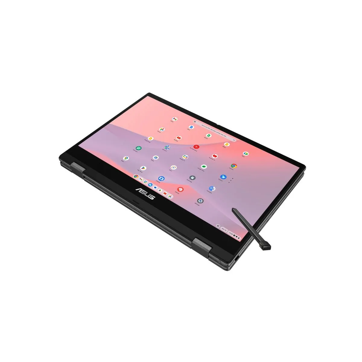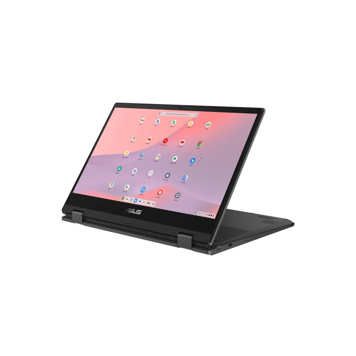 The ASUS Chromebook Flip 14 is a sleek and versatile device designed for productivity and entertainment. Featuring a striking Gravity Grey plastic touch finish, it boasts a 14.0-inch Full HD display with a resolution of 1920 x 1080 and a 250 nits brightness, ensuring crisp visuals for any task.
