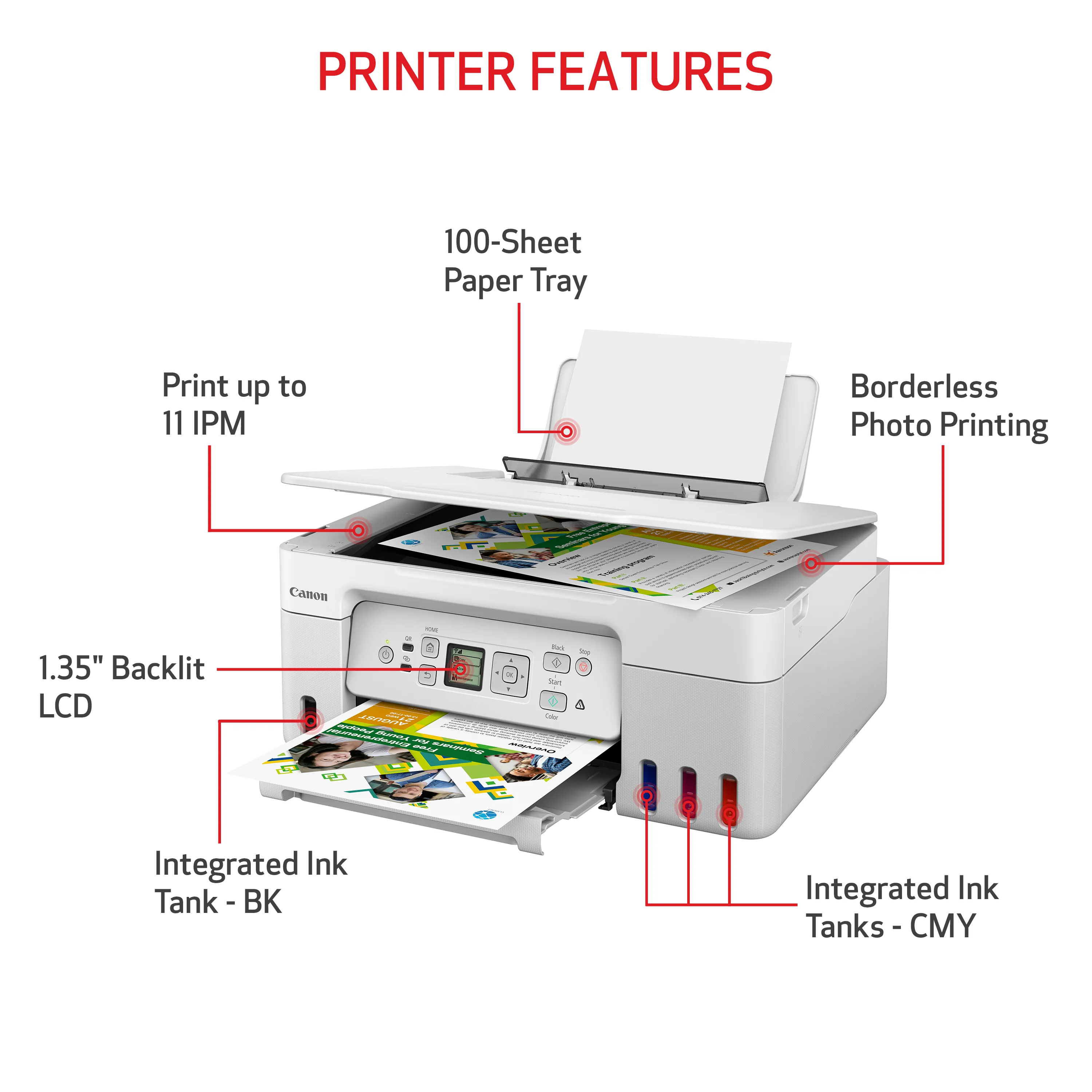 The Canon PIXMA G3270 All-in-One Wireless Printer offers versatile functionality, printing quality photos and documents for both home and office use. It supports a high page yield with its MegaTank system, delivering up to 11 ipm for black and 6 ipm for color prints. With a maximum print resolution of 4800 x 1200 dpi, your prints will be sharp, vibrant, and professional-quality.
