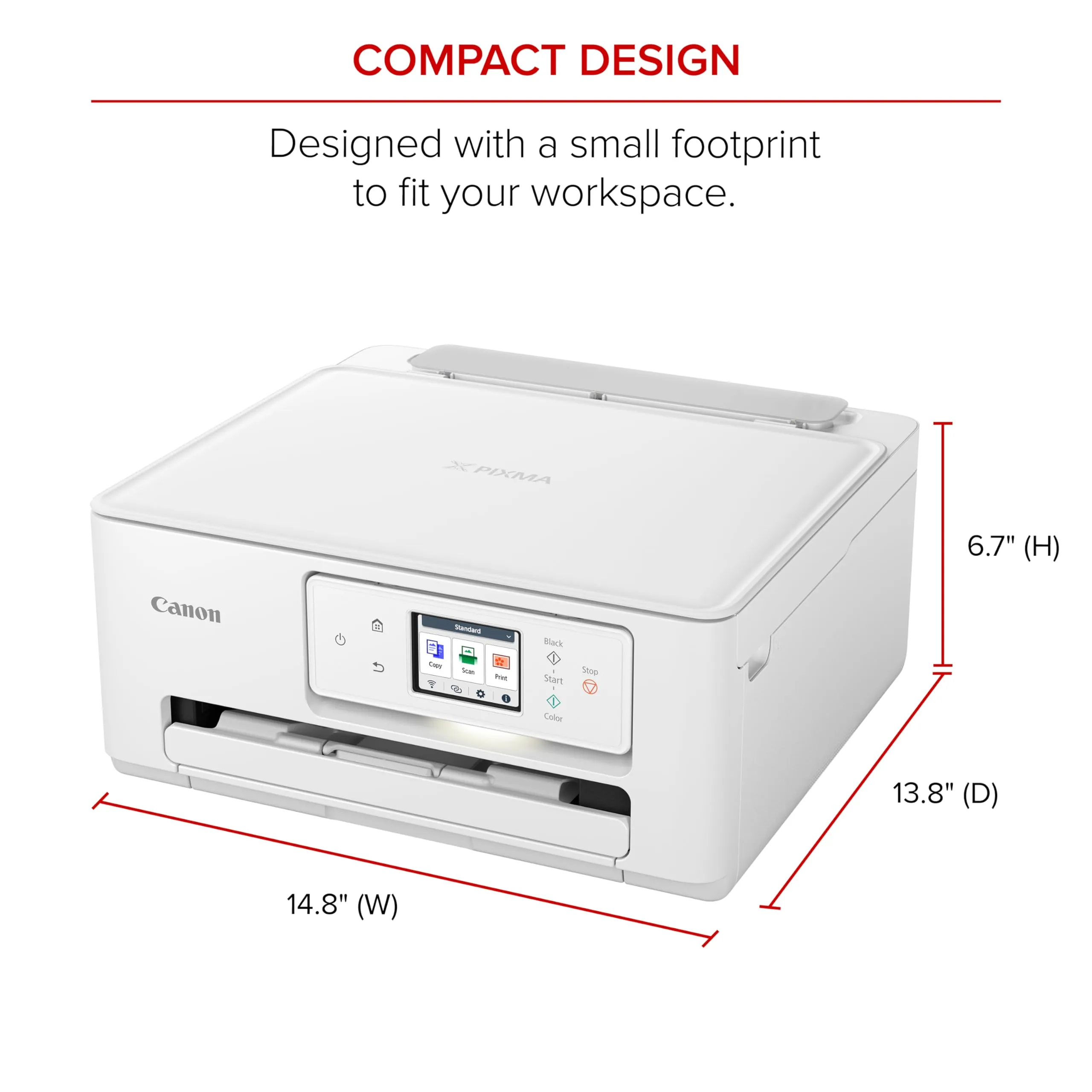The Canon PIXMA TS7720 is a compact and stylish wireless all-in-one inkjet printer designed for home use. It features a 2.7" color touchscreen LCD for easy navigation and a streamlined setup process. The printer uses a 2-cartridge hybrid ink system (one pigment black and one color) for sharp text and vibrant photos. With fast print speeds of up to 15 ipm for black and 10 ipm for color, it also supports automatic two-sided printing to save paper. Its dual paper feeding system includes a front cassette and a rear tray, allowing for a total paper capacity of up to 200 sheets and the flexibility to switch between different paper types. Connectivity options include dual-band Wi-Fi and USB, and it supports mobile printing through apps like Canon PRINT, Apple AirPrint, and Mopria Print Service.