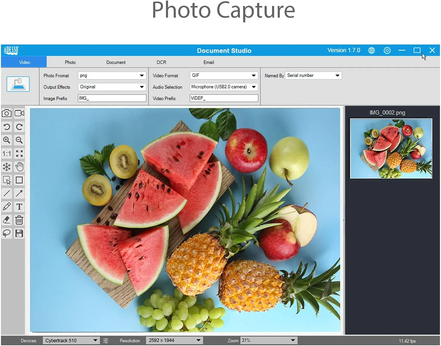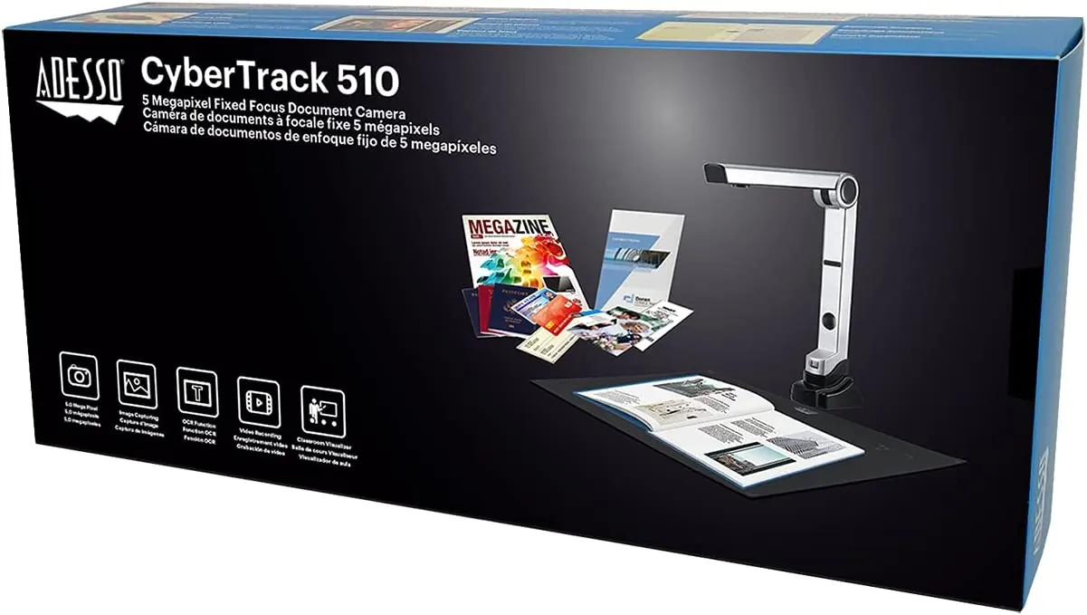 The Adesso Cybertrack 5.0 MP Document Camera is a powerful camera that is capable of using its fixed-focus feature to capture real-time images of 3D objects, magazines, books, documents, pictures, and business cards and present them through a monitor or projector. It's combined with software that allows the user to control more features such as annotation, zoom in, zoom out, video format, image file format, Doc file format, shooting area, and even scanning of single pages or multiple pages. The Cybertrack makes repetitive image capturing, demonstrations, tutorials, and lectures comfortable and simple and makes classroom and office presentation experiences seamless. With the 5.0 MP CMOS sensor and auto-focus down-facing lens, the document camera is the ideal tool for image capturing using its advanced text recognition. Record videos of just about anything, edit images, and videos with the advanced editing tools, plus enjoy the convenience of sharing.