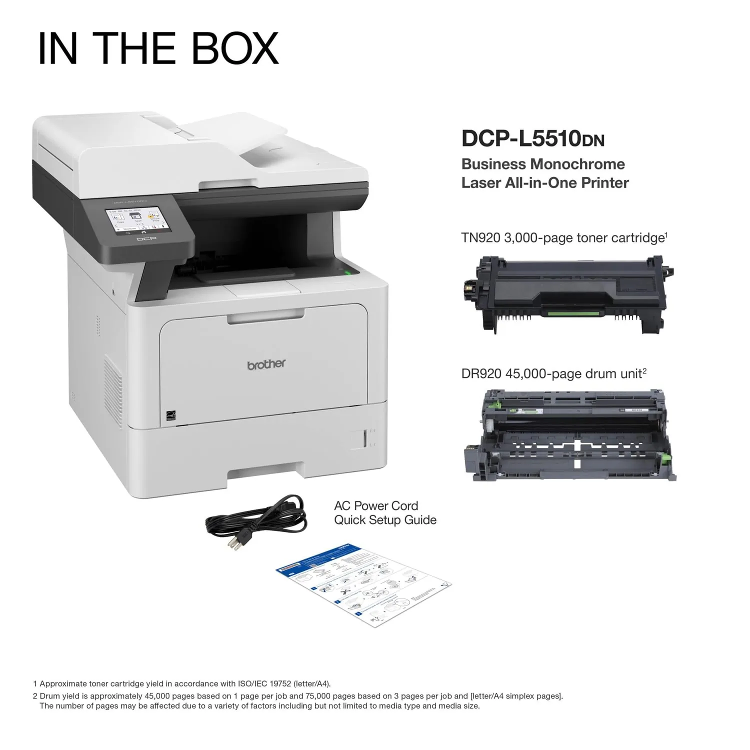 The Brother DCP-L5510DN is a versatile all-in-one laser printer designed for busy workgroups. It offers fast printing, scanning, and copying capabilities, ensuring high productivity. With automatic duplex printing, it helps save on paper costs and is equipped with a large paper capacity to minimize the need for frequent refills. The printer also supports advanced security features to keep sensitive documents safe.
