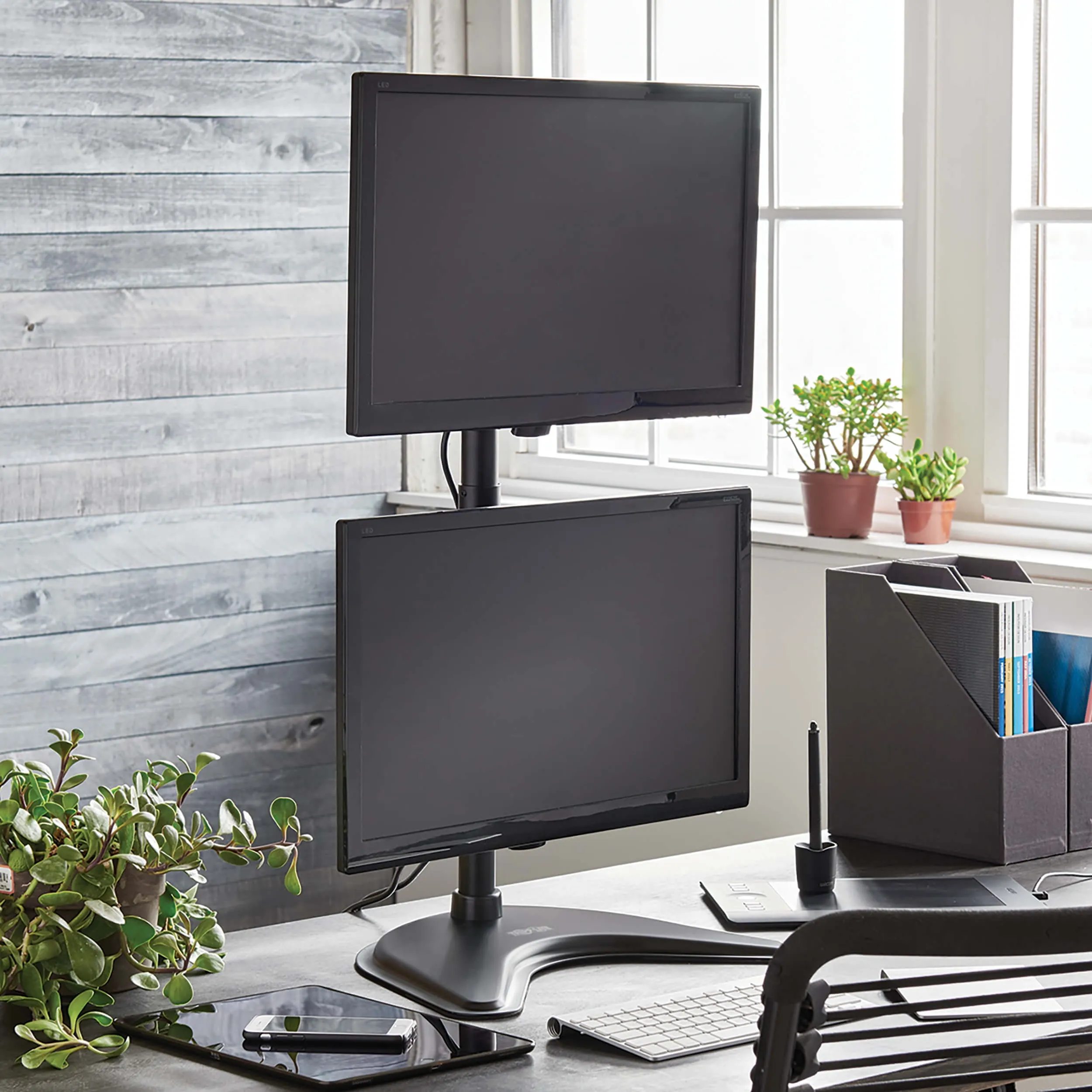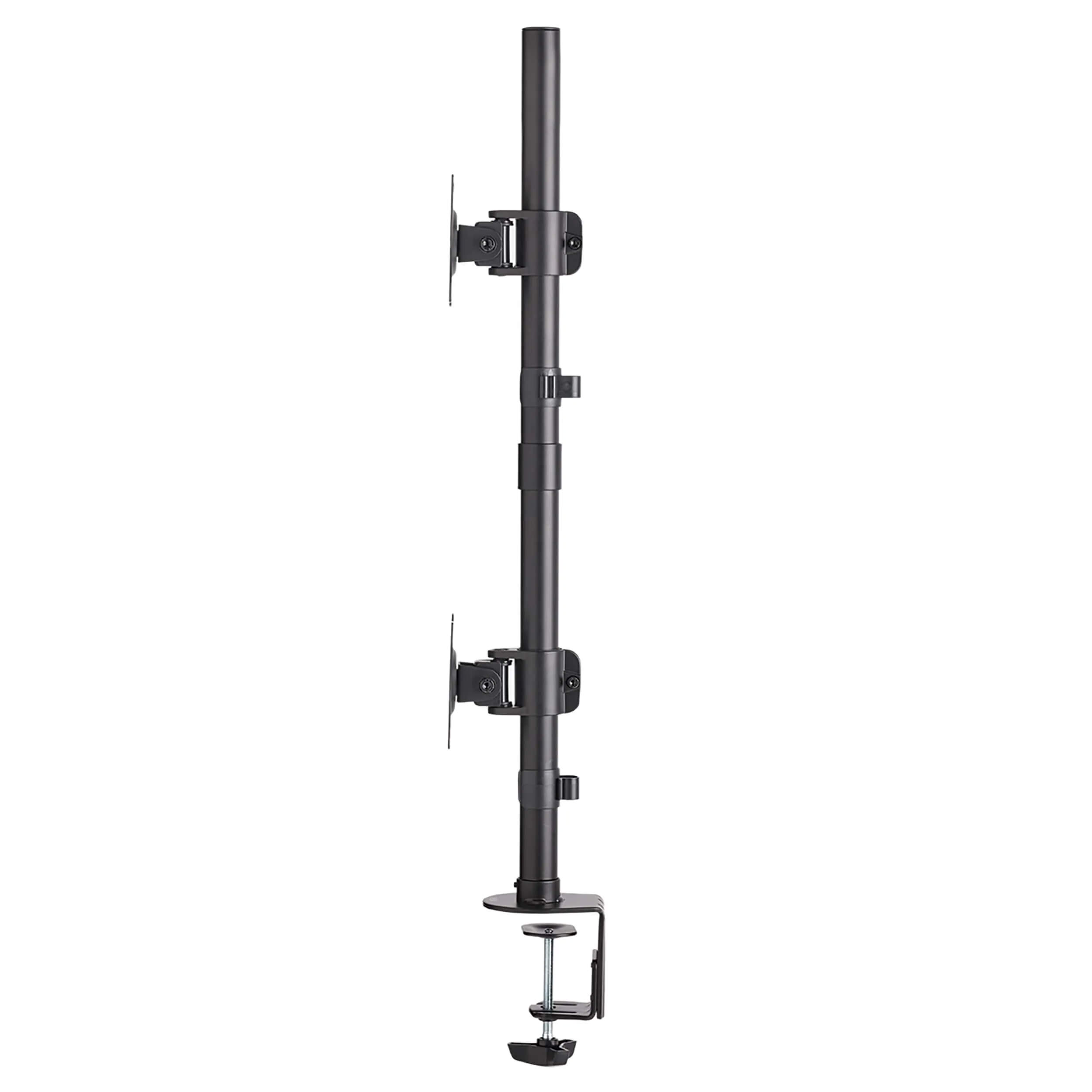 Compatible with Most Desks, Tables and Workstations:Functions as either a desktop stand or clamp-on mount - both mounting options included, Mounts 2 flat-panel displays from 15 to 27 in. on a vertical pole, Dual mounting plates adjust independently for angle and height, Ideal for home and office use, Clamps to flat surface up to 3 in. thick & Convenient One-Touch Adjustment 20 swivel and -20 to +20 tilt capability provide comfortable viewing from multiple angles Full 360 rotation in both portrait and landscape orientations Durable Metal Construction Each mounting plate supports displays up to 18 lb. Scratch-resistant powder-coated finish blends with any dcor Mounting hardware included ? Cable clamps organize cables and reduce clutter VESA Compliance Conforms to VESA-compliant universal mounting hole patterns
