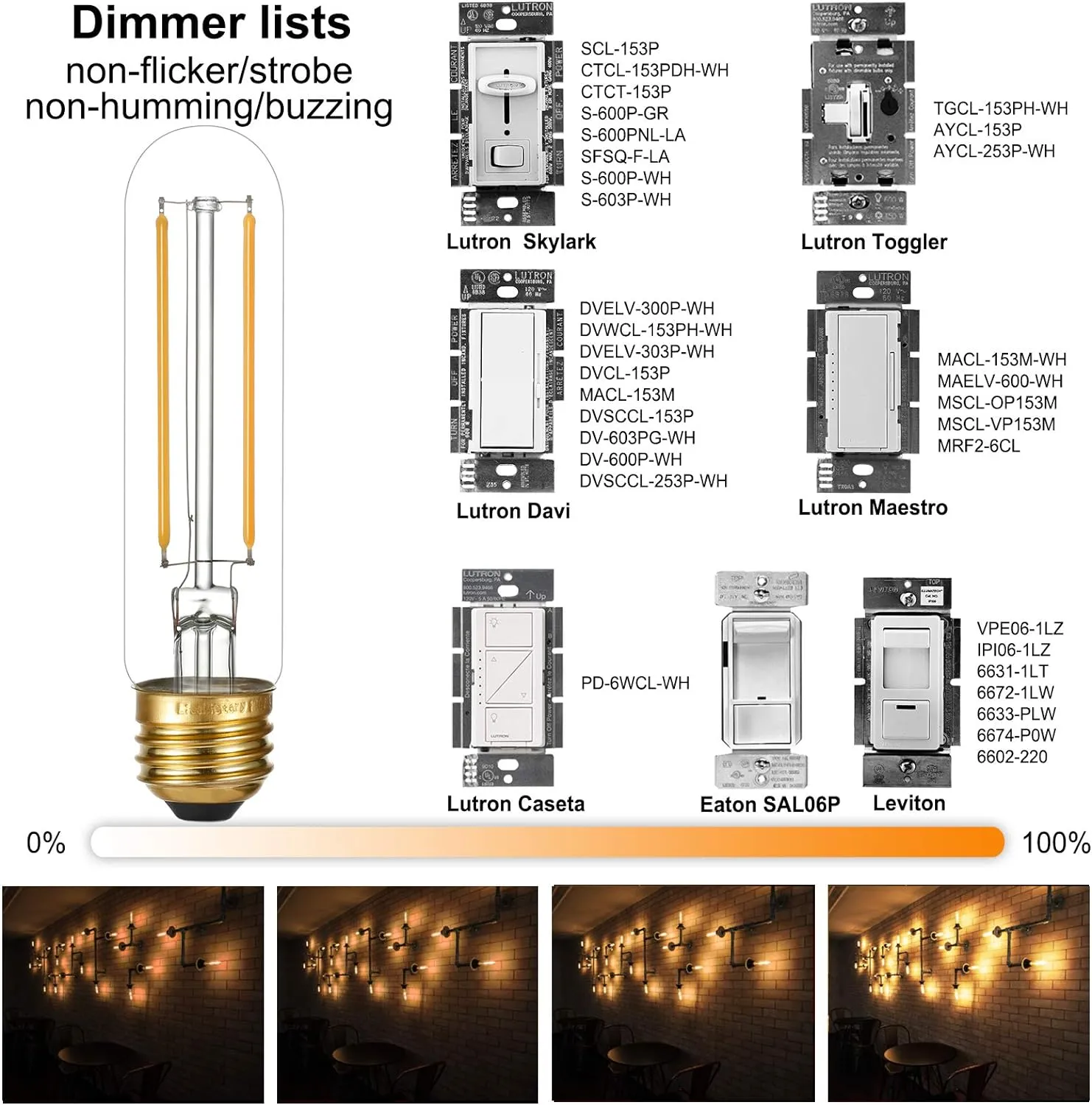 SMOOTH DIMMABLE&SKINNY&LONG:5Inch long E26 Edison bulb is smooth dimming 0%-100%,tested compatible with 95% Lutron,Leviton and Eaton dimmers;Narrow retro e26 LED bulb suitable for most light fixture with medium E26 socket,especially for fixtures with light bulbs in rustic Pendant,Chandeliers,Sputnik,Island,foyer,Wall scones,Vanity,Cabinet,Industrial pipe fixture,piano desk lamp,aquarium bulb,bankers lamp bulb,tank light bulbs,etc.