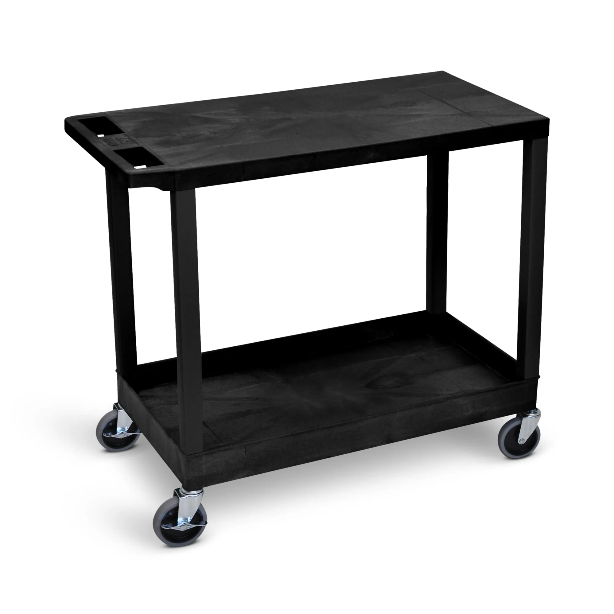 The Luxor Black EC21 Utility Cart is designed for heavy-duty versatility, making it the ideal solution for transporting equipment and supplies. This robust cart can hold and haul up to 500 lbs with ease. It features a dual-shelf design that includes one 2.5"-deep tub shelf on the top and a sturdy flat shelf on the bottom, both crafted from rugged thermoplastic resin that is resistant to scratches, dents, stains, and rust.
