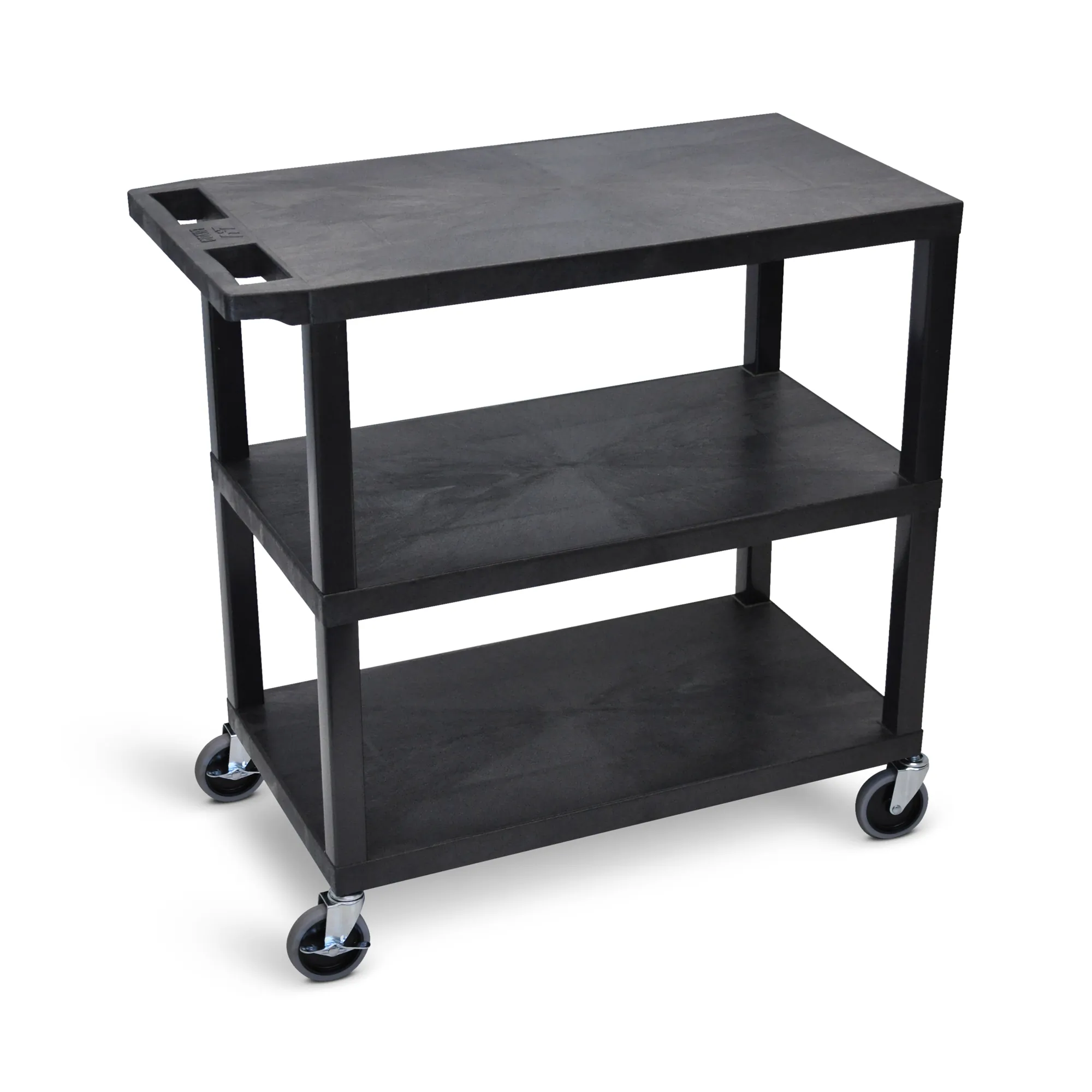 Constructed in the USA for durability, this Luxor utility cart features three robust shelves designed for transporting or storing supplies, inventory, and more. The thick thermoplastic resin is engineered to resist scratching, denting, staining, and rusting, with a weight capacity of up to 400 lbs. Despite being fully loaded, the cart is easy to maneuver thanks to a convenient push handle integrated into the top shelf and four 4" swiveling casters. Ideal for use in warehouses, food service environments, schools, or industrial settings.