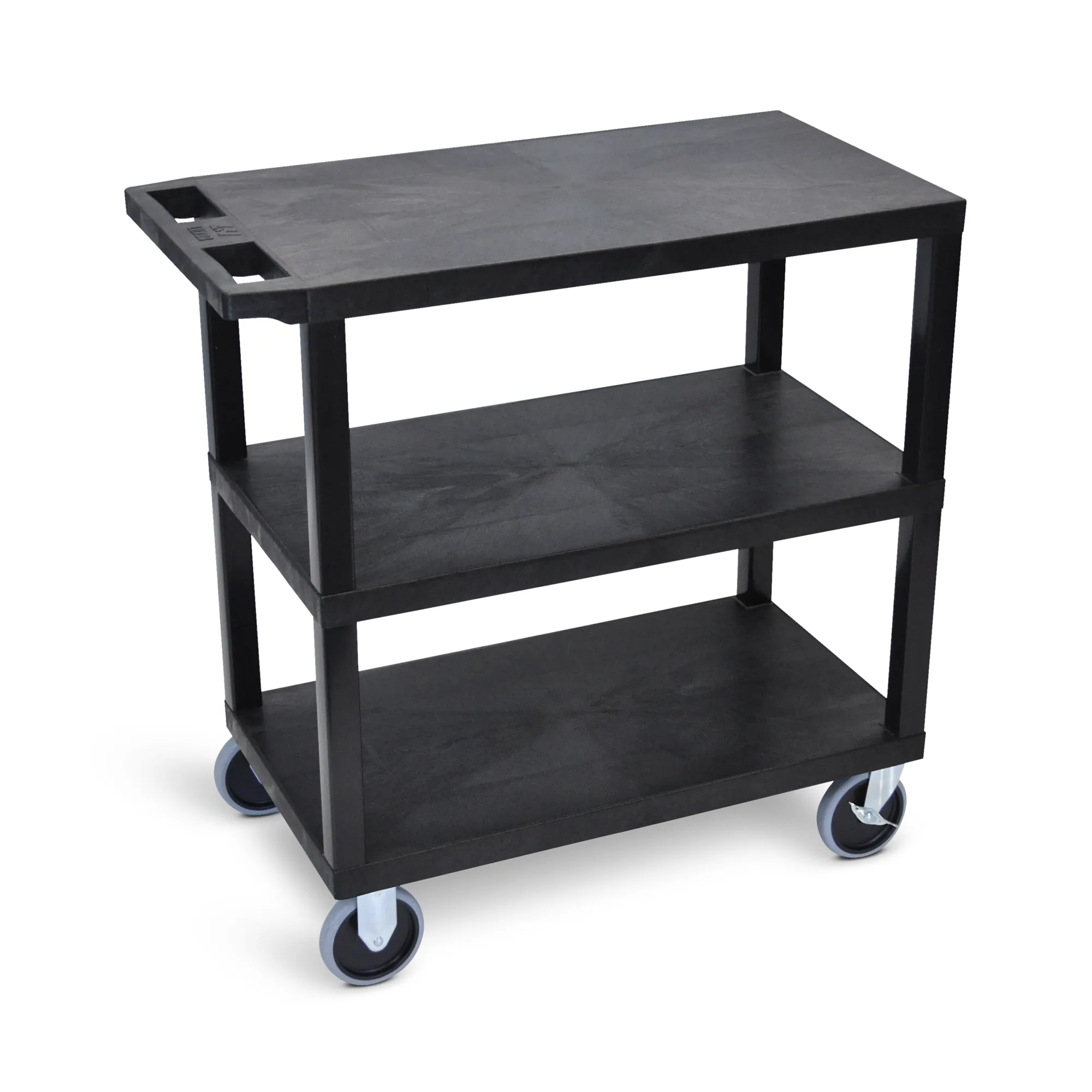 Equipped with an ergonomic push handle molded into the top shelf, maneuvering this cart is simple and efficient. Additionally, it is fitted with 5" heavy-duty casters—two fixed and two full-swivel with a locking brake—allowing for smooth transportation across various surfaces.