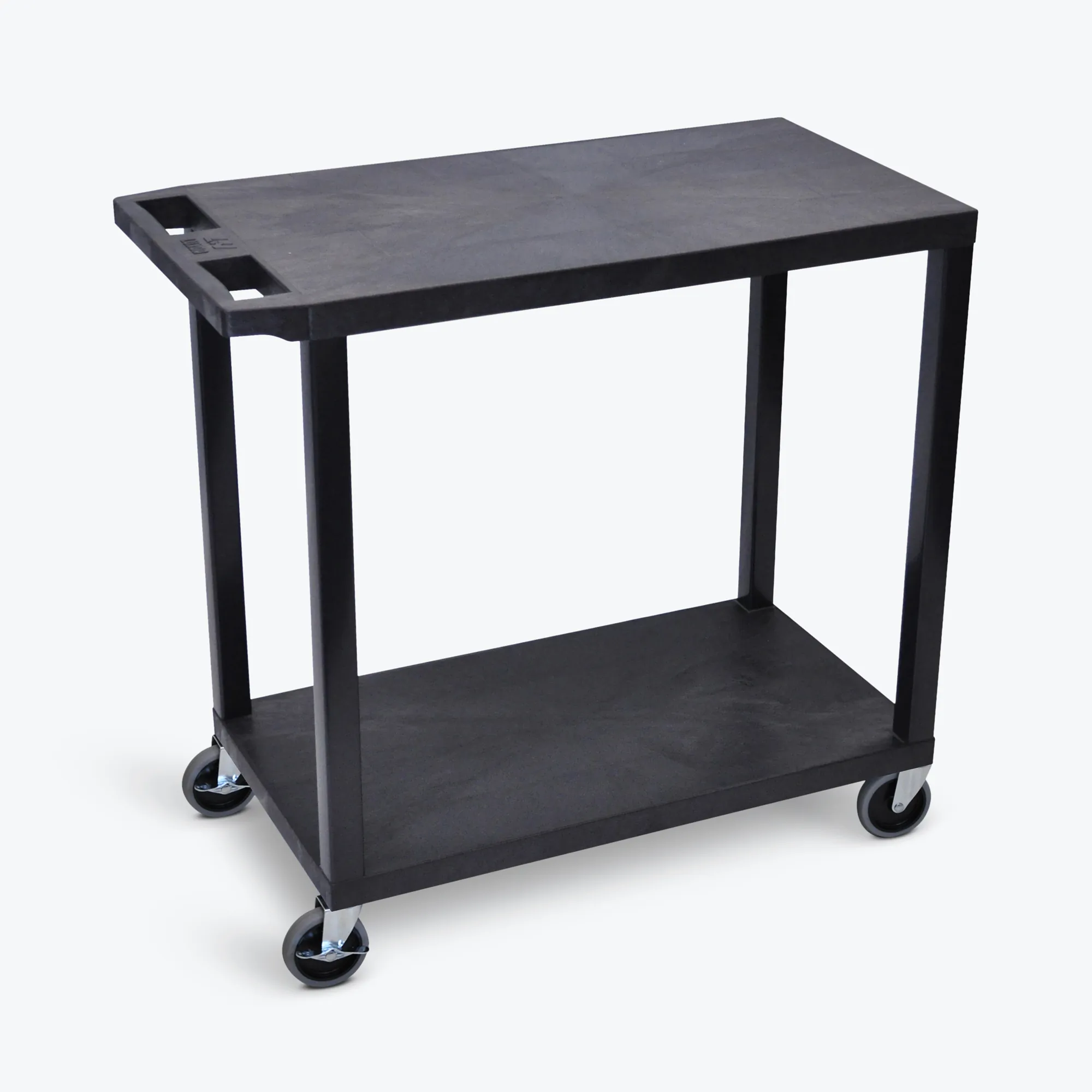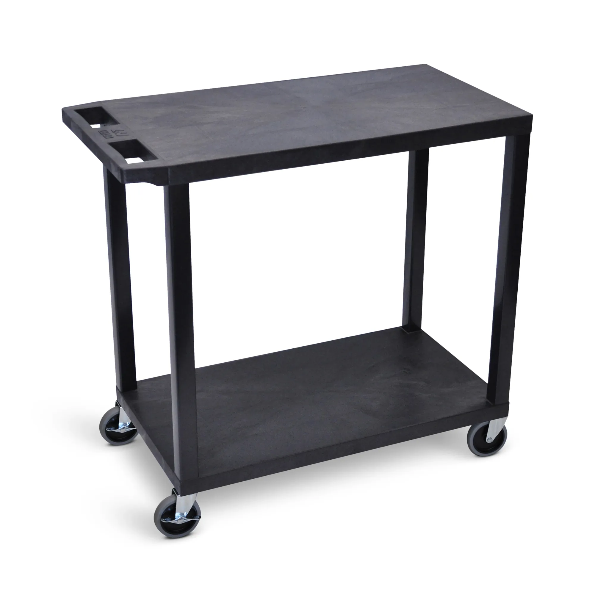 The Luxor EC22-B is a heavy-duty utility cart designed for convenience and durability. With two spacious flat shelves that are over 1.5 inches thick, it can hold up to 400 lbs. in total. The molded push handle on the top shelf and the swiveling casters, two of which feature locking brakes, ensure that this sturdy cart is easy to maneuver and stabilize. Its tough thermoplastic resin construction means it won't stain, scratch, dent, or rust, making it suitable for various environments.