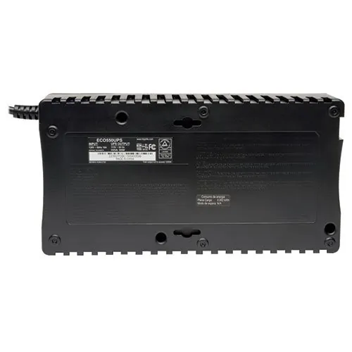 General InformationThe ECO650UPSM standby green UPS offers complete protection from blackouts, brownouts and transient surges. Supports green energy savings via built-in Eco outlets that automatically power off unused computer accessories like printers or multi-media speakers when the computer is not in use. Full load efficiency rating of 99% also offers energy-savings and cooler operation by limiting UPS power consumption to less than 4 watts! Eco-friendly design meets strict RoHS environmental standards. Provides uninterrupted transition to battery-derived AC output during brownouts and power failures with enough runtime to save and shutdown connected equipment without data loss. Offers complete protection in an ultra-compact desktop or wall-mountable housing. Includes 4 battery supported outlets for computer, monitor and two vital system peripheral, plus 4 additional surge suppression-only outlets for accessories not requiring battery support. Three of the surge-only outlets are designated Eco outlets that can be configured to automatically power-off when the computer enters standby mode or is shutdown. USB port enables UPS configuration options and unattended system shutdown without data loss in the case of extended power failure. PowerAlert software is available via free download from www.tripplite.com. USB cable included. Built-in single line RJ11 phone suppression protects modem, fax machine, cordless phone or other accessories with a dialup/DSL phone connection. Built-in audible alarm and front panel LEDs offer continuous status information regarding line and battery power operation. 650VA / 325 watt power handling ability supports a 60 watt PC with monitor for up to 30 minutes during power fail conditions. $100,000 connected equipment insurance (USA, Puerto Rico, & Canada Only).Technical InformationPlug/Connector Type: NEMA 5-15PReceptacles: 8 x NEMA 5-15RDataline Protection: RJ-11Protection Type: SurgeProtection Type: Black OutProtection Type: BrownoutProtection Type: TransientProtection Type: EMI / RFIBypass Switch: OptionalCord Length: 6 ftPower DescriptionLoad Capacity: 650 VA/325 WInput Voltage: 120 V ACOutput Voltage: 115 V ACOutput Voltage: 120 V ACInput Current: 10 AWaveform Type: Pulse-width Modulated Sine WaveSurge Energy Rating: 420 JManagementAlarm: OverloadAlarm: Power FailureControls/IndicatorsStatus Indicators: Power StatusOverload/check batteryECO-mode statusInterfaces/PortsModem (RJ-11): YesUSB: YesBattery InformationBackup/Run Time (Half Load): 11 MinuteEnvironmental ConditionsMaximum Operating Temperature: 104F (40C)Physical CharacteristicsHeight: 3.1"Width: 10.8"Depth: 5.7"Form Factor: DesktopForm Factor: Wall MountableWeight (Approximate): 6.60 lbMiscellaneousPackage Contents: Eco 650VA Energy-saving Standby 120V UPS with USB Port and Muted AlarmUSB CableInstruction ManualCertifications & Standards: UL1778 (USA)CSA (Canada)NOM (Mexico)Meets FCC Part 15 Category B (EMI)Environmentally Friendly: YesEnvironmental Certification: ENERGY STAR 2.0Environmental Certification: RoHSWarrantyLimited Warranty: 3 Year