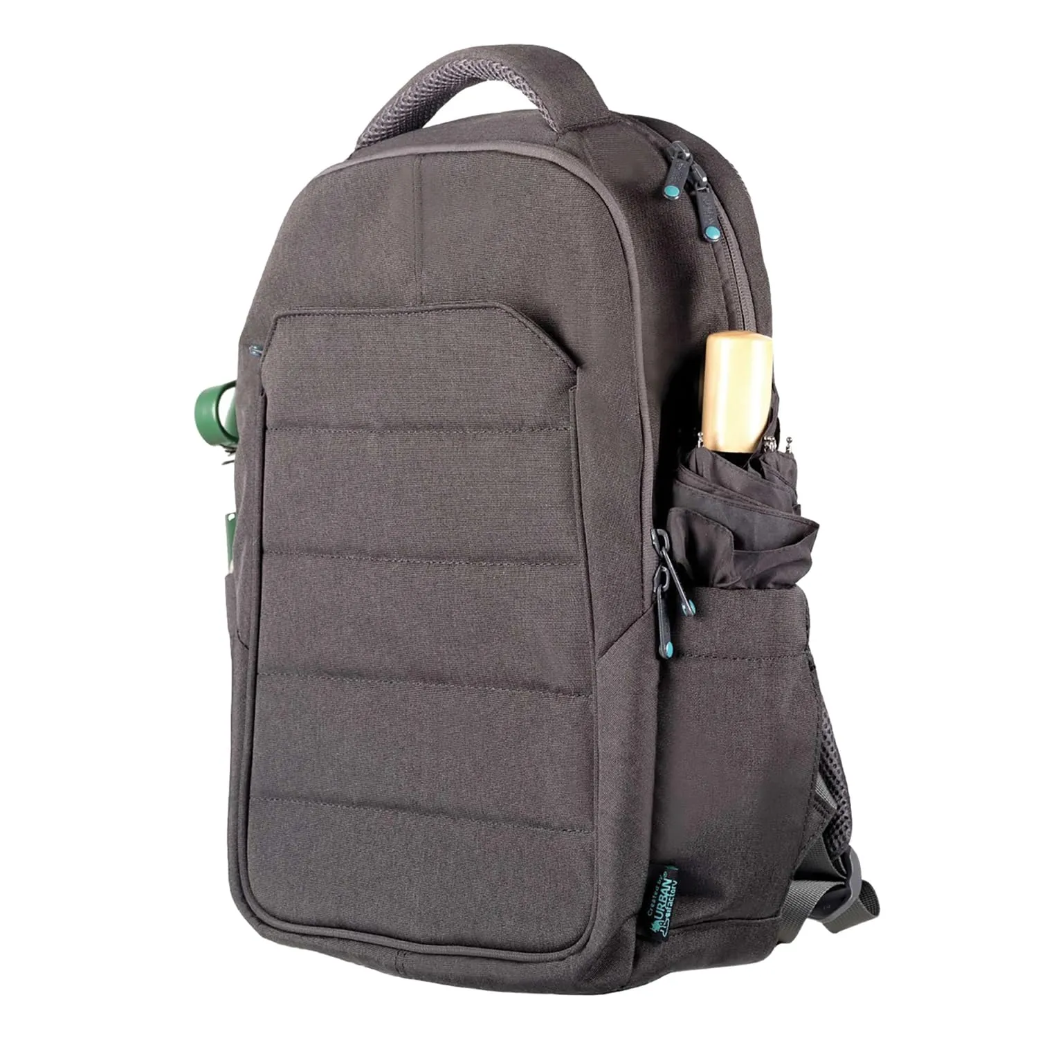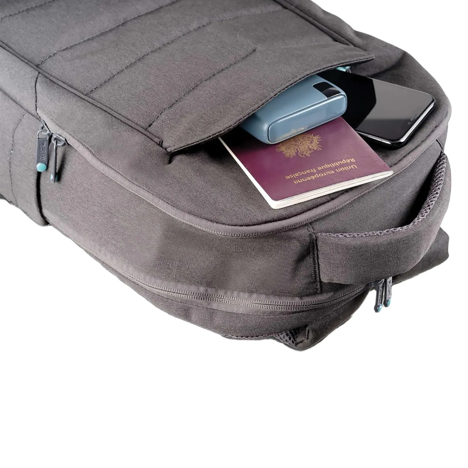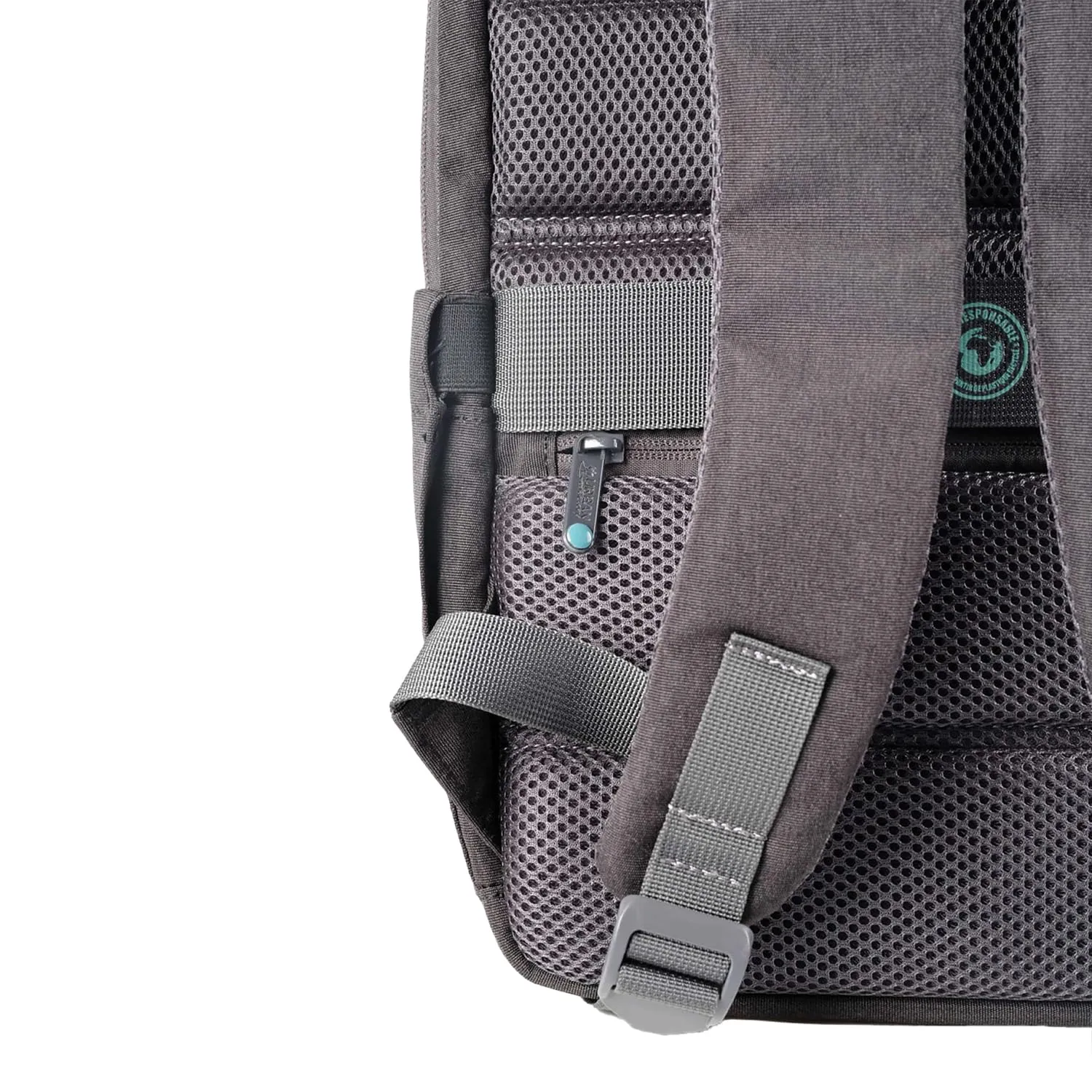 • Reinforced computer compartment up to 15.6 in. devices;• Compartment for personal items;• Flat front pocket for quick access;• Trolley and baggage hook at back of backpack for easy portability;• Expandable side pockets;• Secret pocket to protect your sensitive devices ;• Multiple inner storage pockets ;• Reinforced handles and shoulder straps;• Made with r-PET (recycled fabrics from plastic bottles);• Elegant and compact design;• 15.6 In.;
