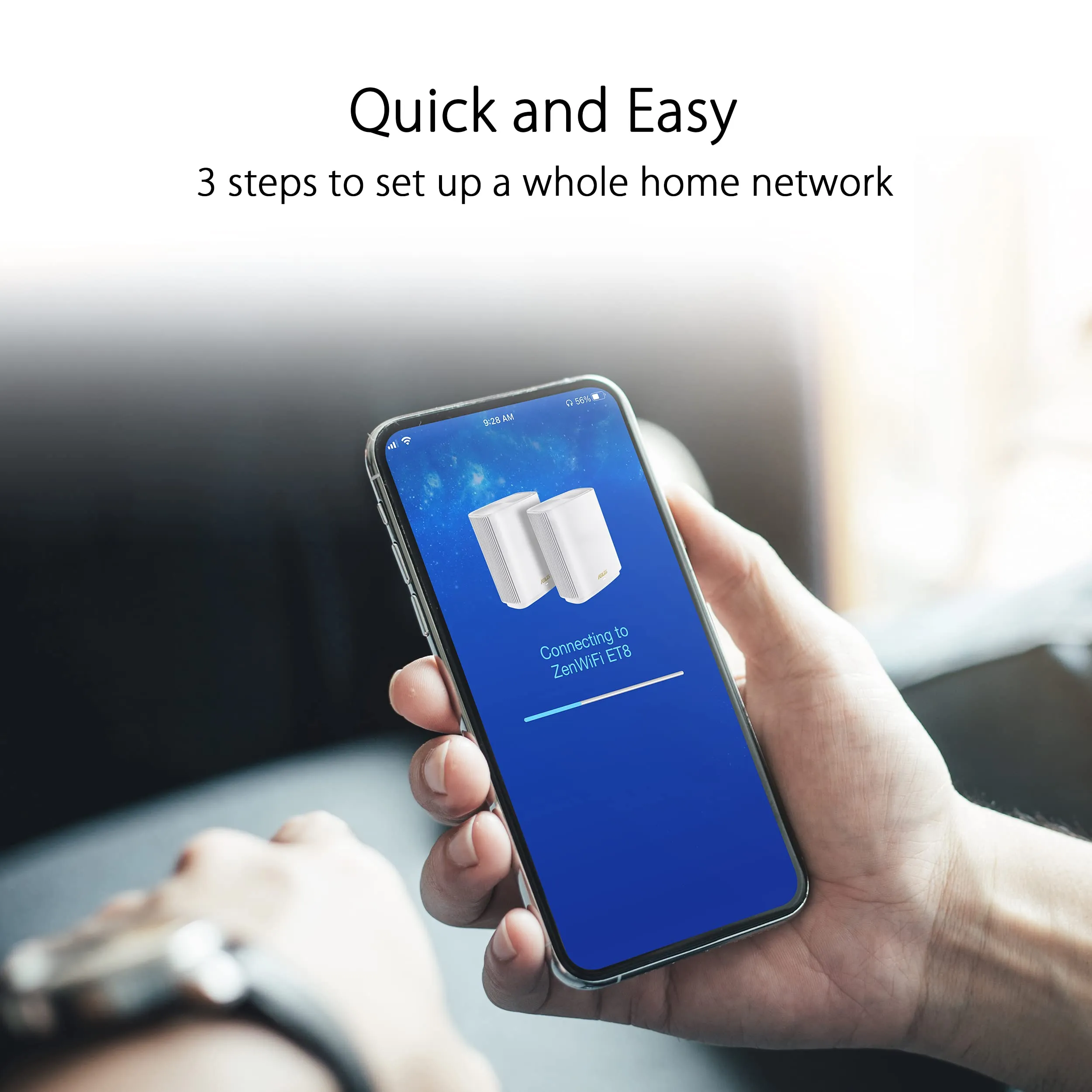 The ASUS ZenWiFi ET8 is a state-of-the-art Tri-band Mesh WiFi 6E System, designed to provide exceptional coverage of up to 7,500 sq.ft. Experience blazing fast speeds of up to 6600Mbps with the addition of a new 6GHz band. This system includes advanced features such as AiMesh technology for seamless connectivity, Lifetime Free Internet Security for peace of mind, robust Parental Controls for a safer browsing experience, easy setup, and an Instant Guard for network protection.