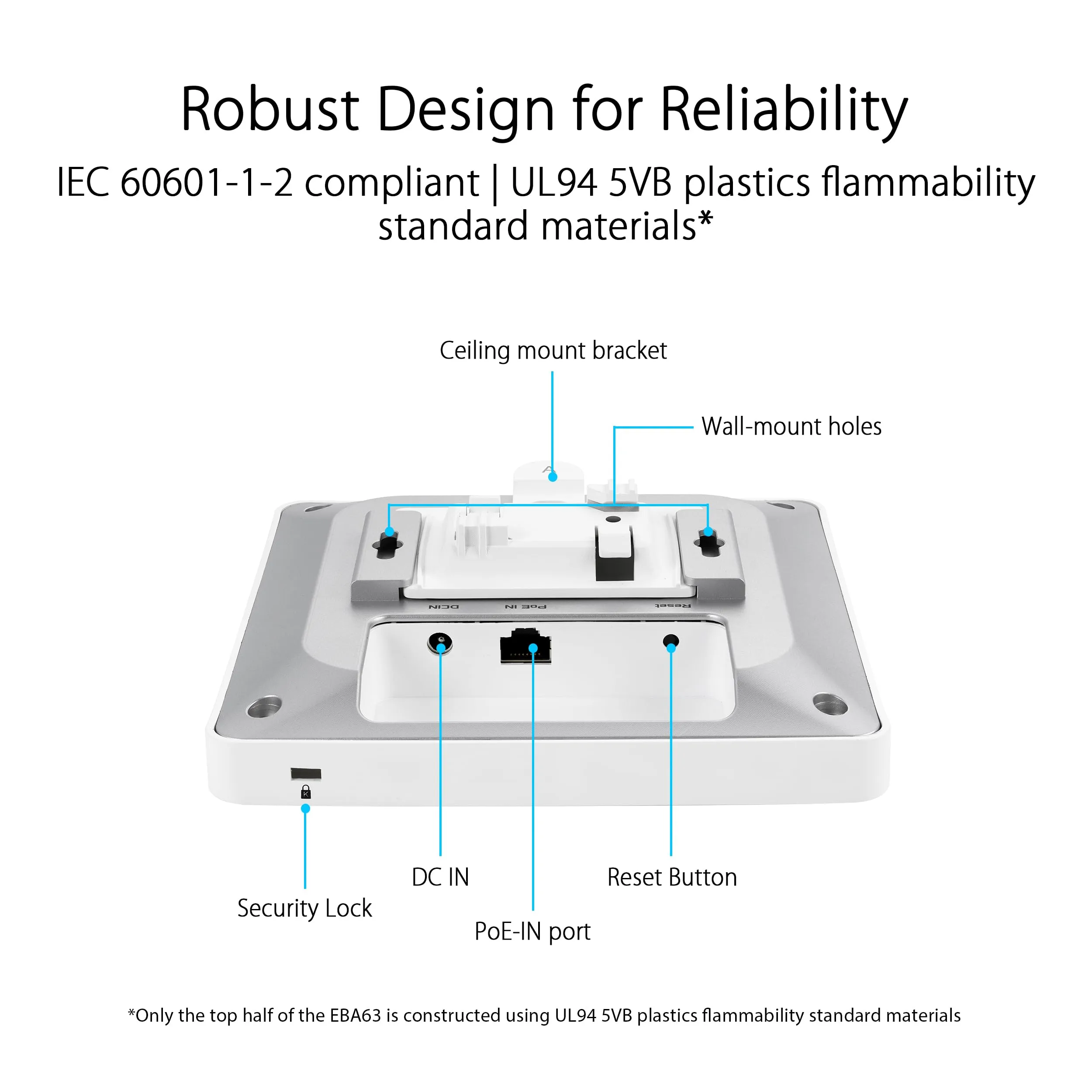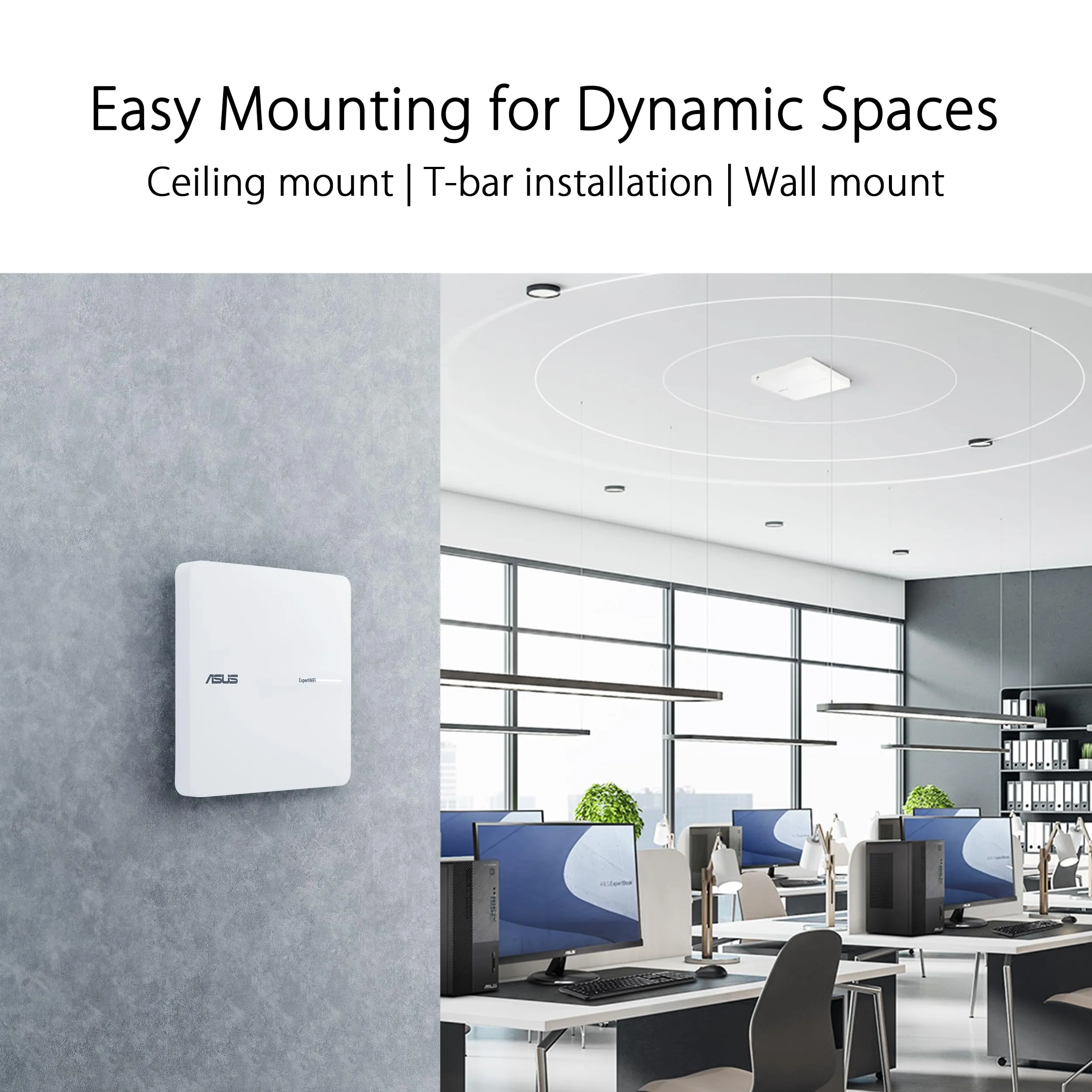 The ASUS NT EBA63 is a high-performance dual-band WiFi 6 access point designed to enhance your wireless network. It supports 802.11ax standards for speeds up to 3000 Mbps, making it ideal for both home and office environments.