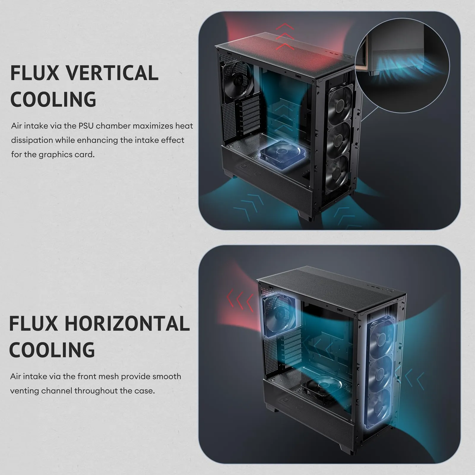 Experience exceptional airflow and modern aesthetics with the Antec FLUX Mid-Tower E-ATX PC Case. Designed to house advanced gaming setups, it supports up to 420mm radiators and offers ample space for back-connect motherboards.