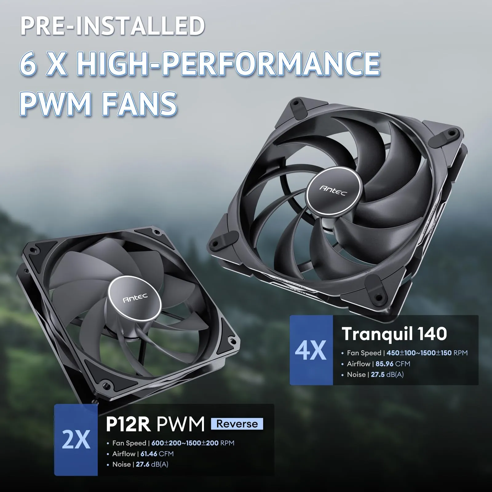 The Antec FLUX Pro is a full-tower E-ATX PC case designed for high performance and superior airflow. Featuring a sleek black design with a stylish walnut wood front panel, this case not only looks great but also ensures optimal cooling for your components.