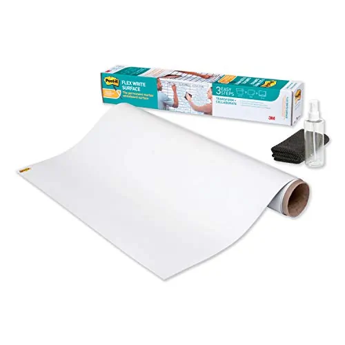 Post-it Flex Write Surface gives you the flexibility to instantly transform your worksurface into a whiteboard and the freedom to write with even a permanent marker without stains. Long-term planning is easier than ever with the use of permanent markers to prevent accidental smearing and erasing. Permanent marker wipes away with water. Remove writing from a dry-erase marker with a cloth. With just three easy steps, this whiteboard surface is simple to use to capture your team's ideas, inspire creative thinking and track projects. First unroll the whiteboard surface. Peel off the backing and then stick to your worksurface. The flexible whiteboard removes cleanly with no damage to your wall or repurposed blackboard or stained whiteboard.