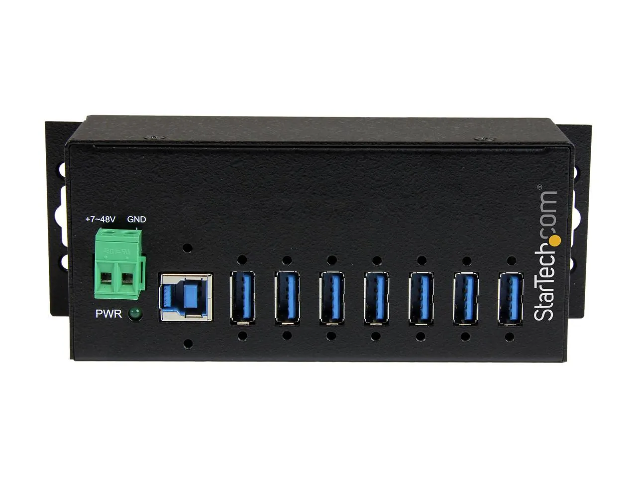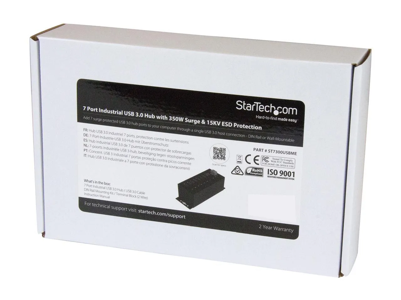 The Industrial USB 3.0 Hub provides 7 ports for connecting multiple devices simultaneously. Equipped with an external power adapter, this hub ensures stable connectivity and enhanced performance. It features ESD protection and safeguards against surges up to 350W, making it ideal for industrial environments.