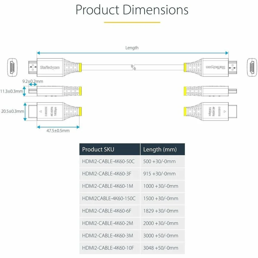 StarTech CB HDMI2-CABLE-4K60-3F 3ft Premium Certified High Speed HDMI 4K Cable