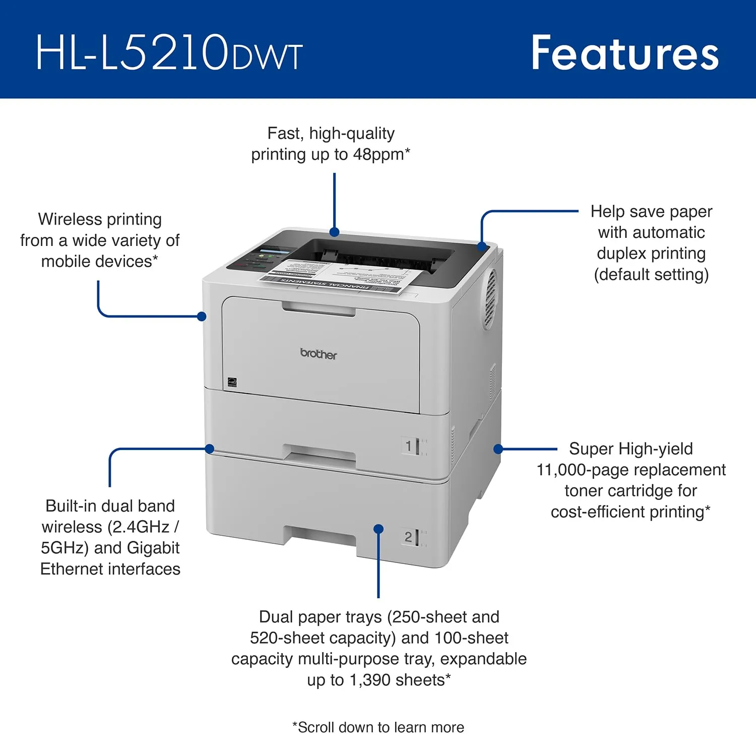 The Brother HLL5210DWT business monochrome laser printer is a great choice for busy offices and small workgroups that need cost efficient printing, versatile paper handling, advanced security features, and reliable, high quality output. This high performance printer helps to increase productivity with a fast print speed of up to 48 ppm 1. Reduce paper refills with dual 250 sheet and 520 sheet capacity paper trays. Offers expandable paper capacity that is scalableas your business needs grow. Delivers costefficient printing by using the Brother GenuineTN920XXL super highyield replacement toner cartridge. Triple Layer Security features help tolimit document and device access and protect against network intrusions. The HLL5210DWTalso provides flexible connectivity with builtin Gigabit Ethernet and dual band wirelessnetworking, plus convenient mobile device printing to meet mobile workforce demands 2.
