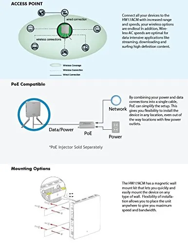 The HW17ACM Wireless 1750AC Managed Access Point is designed to provide high-speed wireless connectivity for both home and business environments. It offers robust management features, ensuring seamless integration into existing networks.