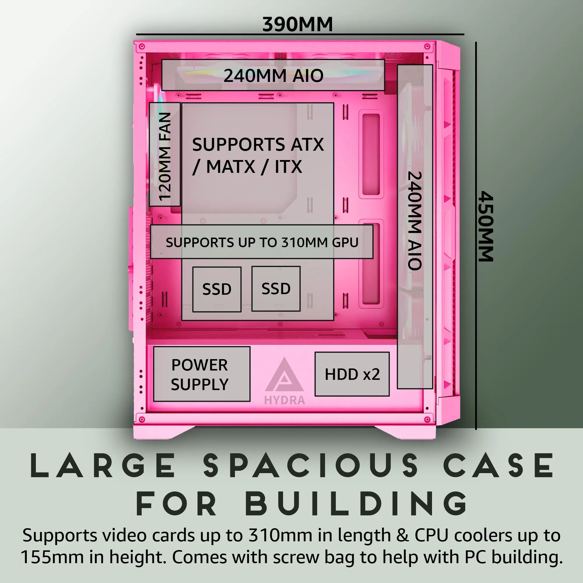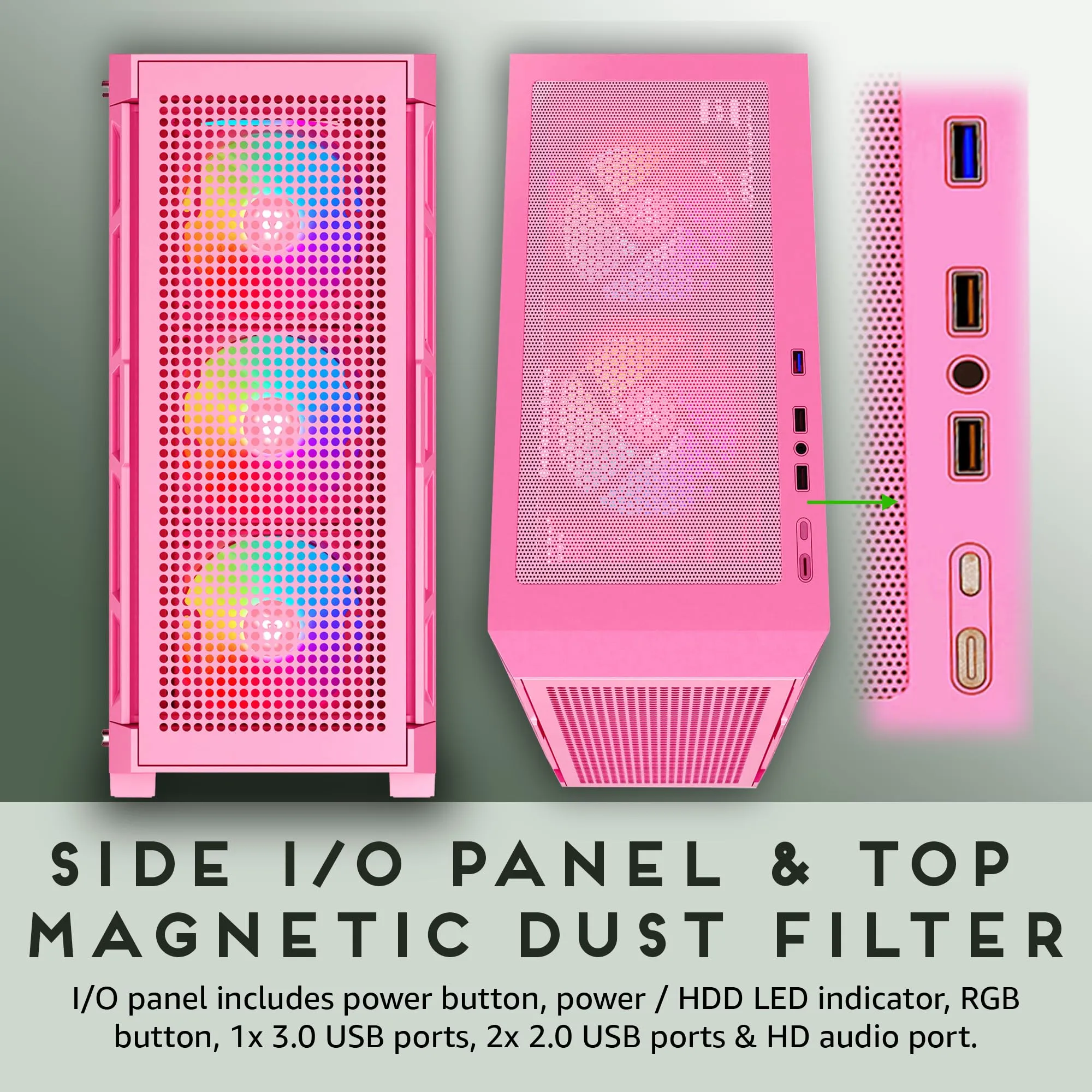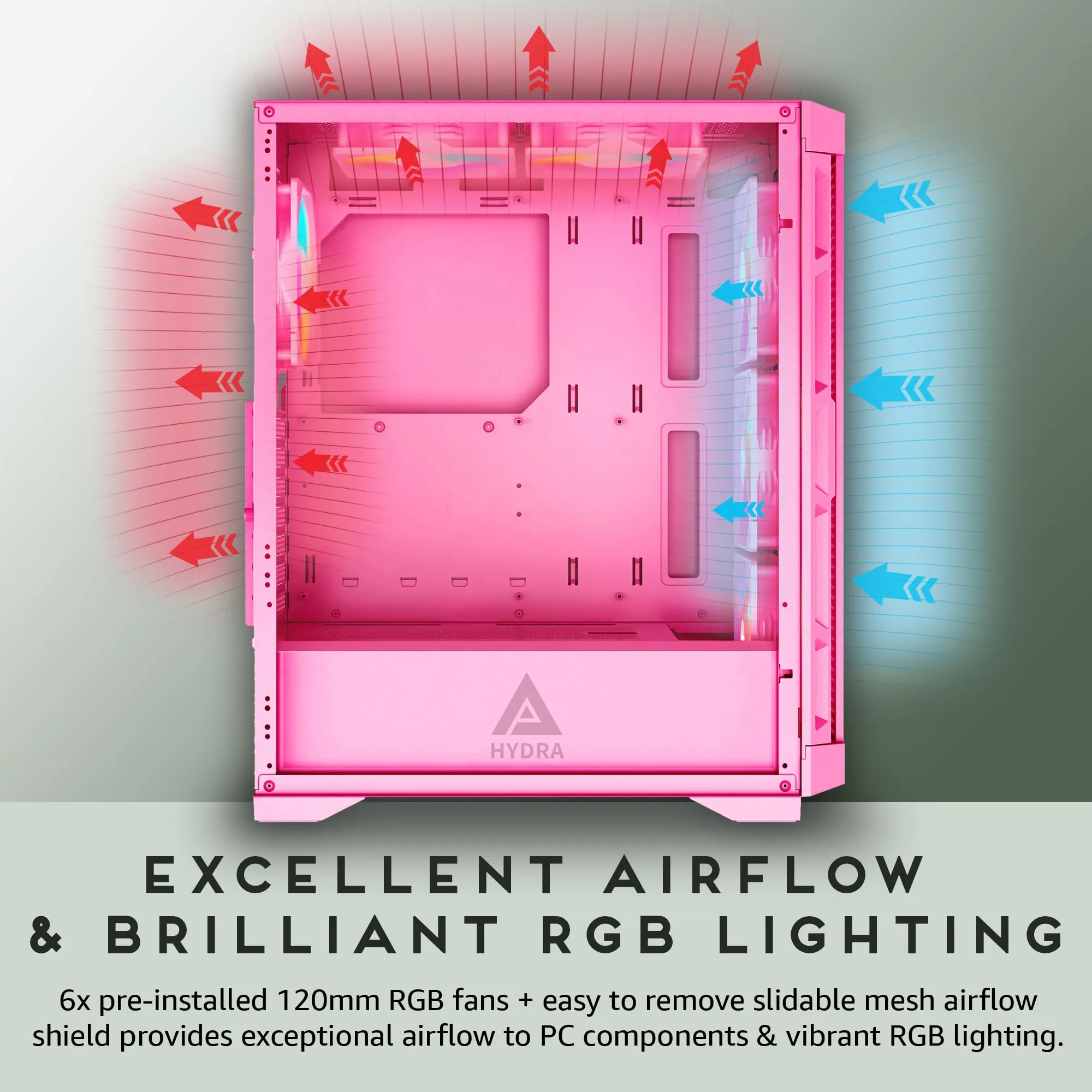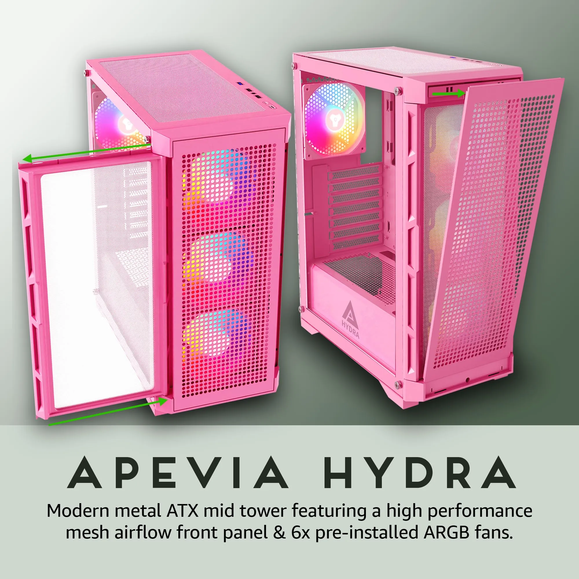 The APEVIA Hydra HYDRA-PK Metal Mid Tower Chassis is a stylish and functional case designed for gamers and PC enthusiasts. With a captivating pink finish, it features a tempered glass window and an airflow mesh panel for optimal cooling. The chassis comes equipped with six RGB fans that not only enhance cooling performance but also add vibrant lighting effects to your build.