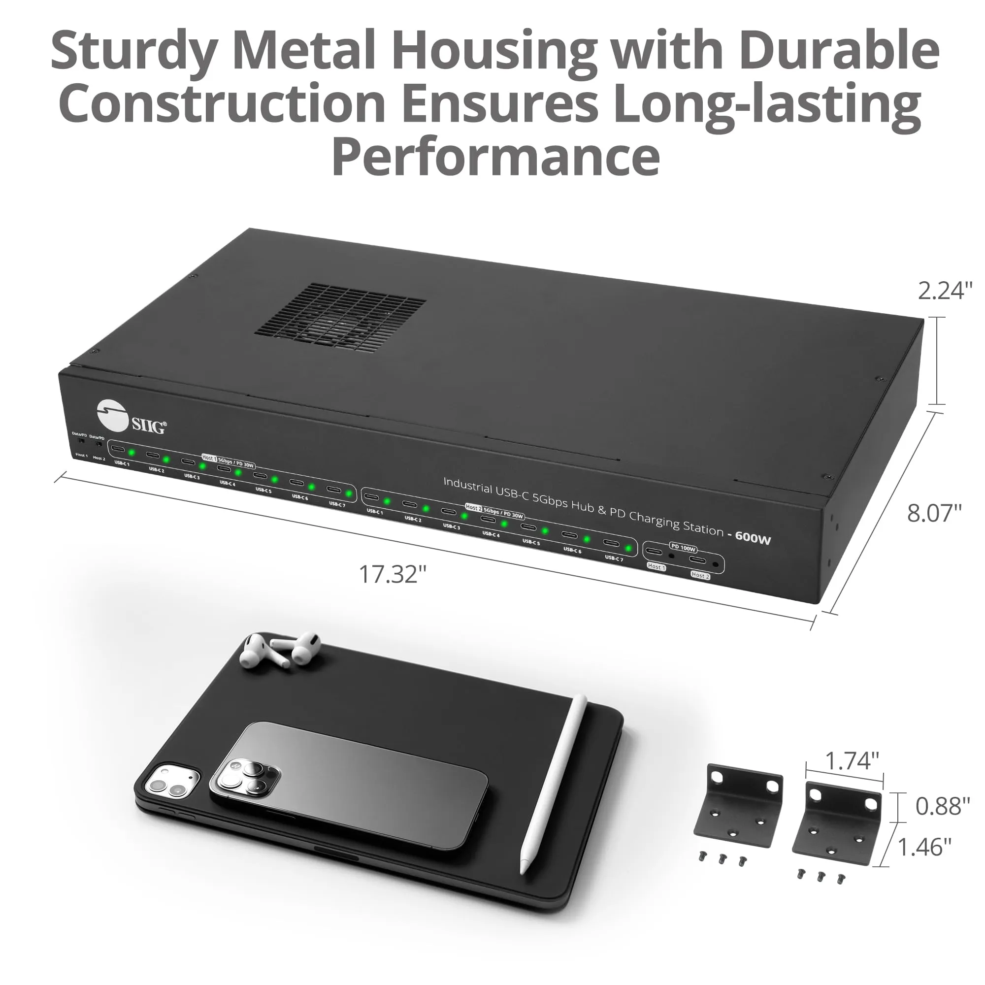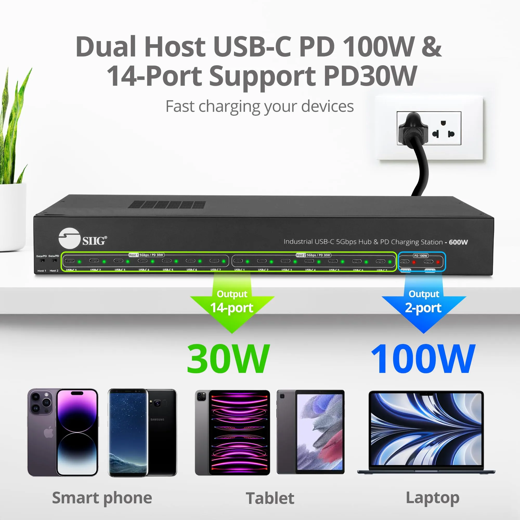 Introducing the SIIG Industrial Grade USB-C Hub and PD Charging Station. This robust device features a 5Gbps data transfer rate, allowing seamless connectivity for your devices. With 16 USB-C charging ports, including a 2-port 100W outlet for host connections and 14 ports providing up to 30W for various USB-C devices, it’s perfect for heavy-duty applications.