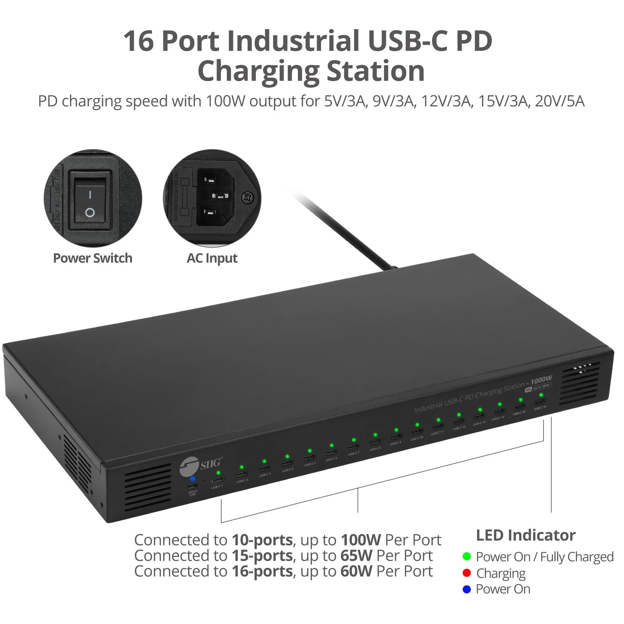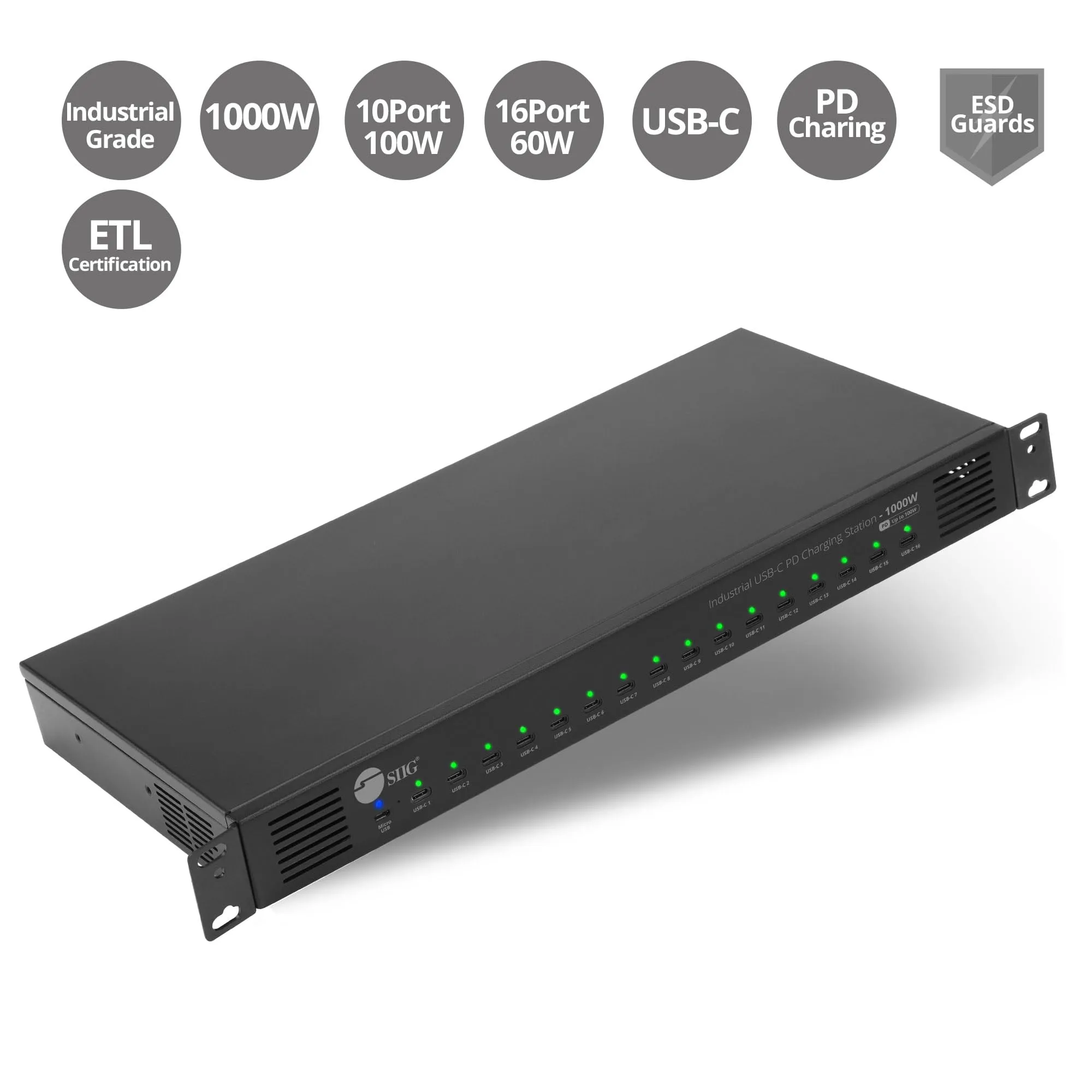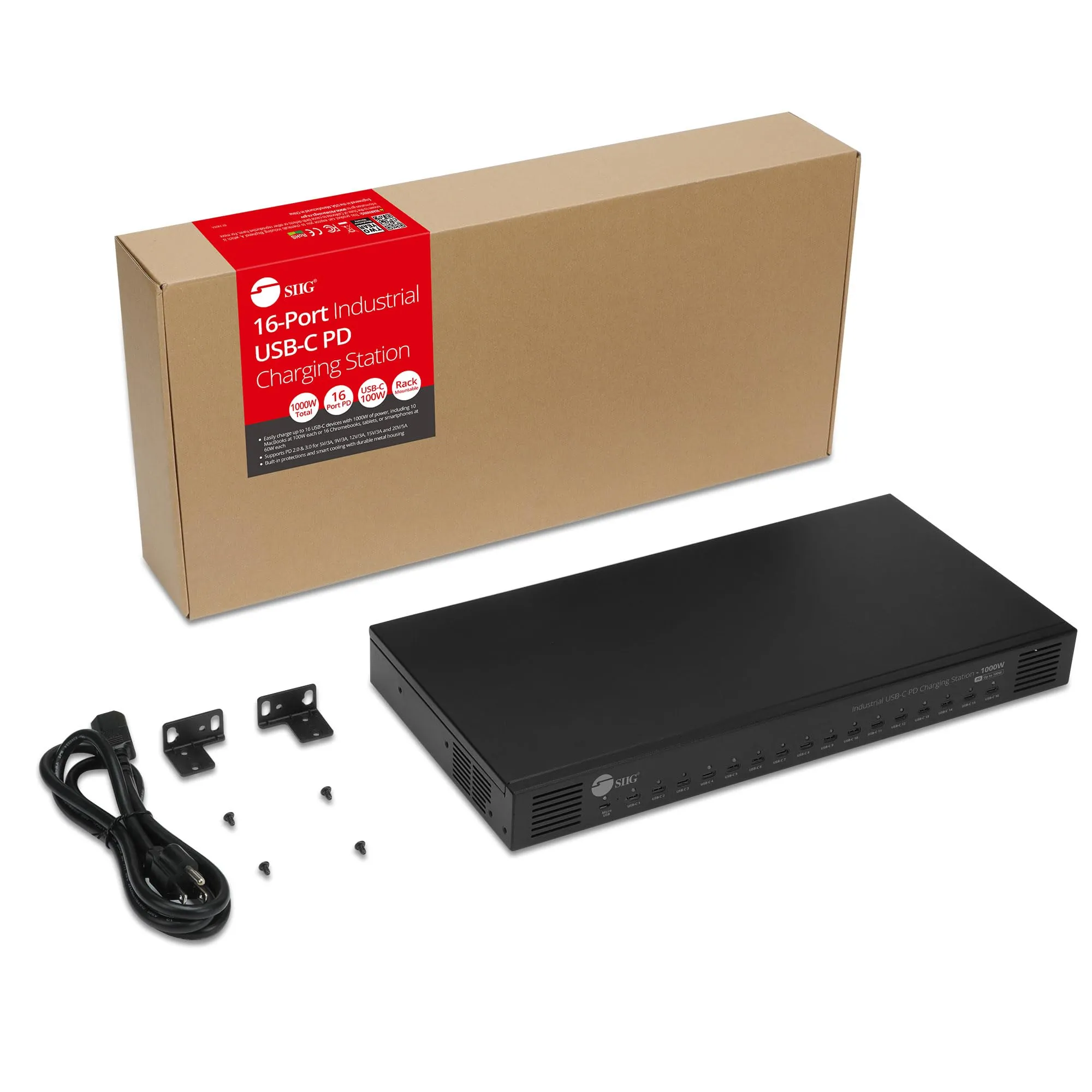The SIIG 16-Port Industrial USB-C PD Charging Station is designed for efficient and reliable charging of multiple devices simultaneously. With a robust 1000W power output, it ensures fast and seamless charging for various USB-C enabled devices.