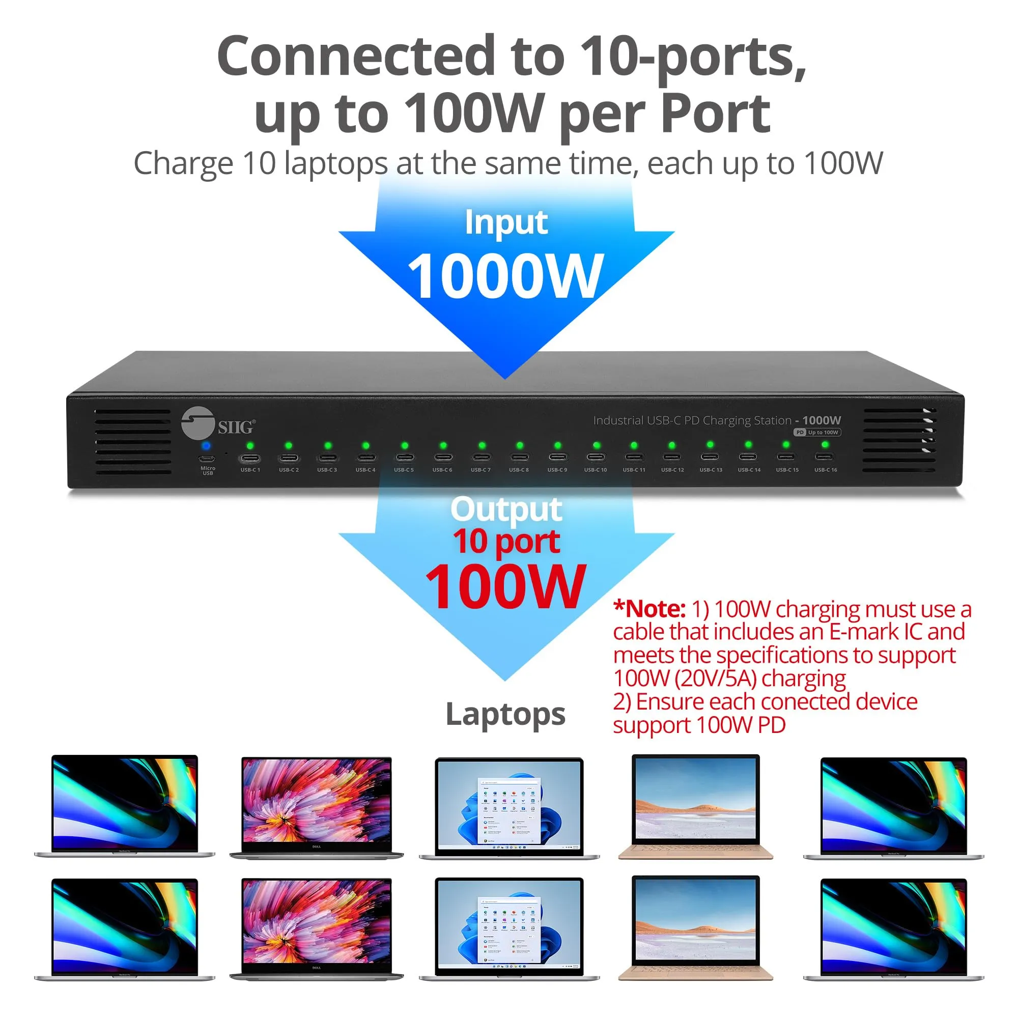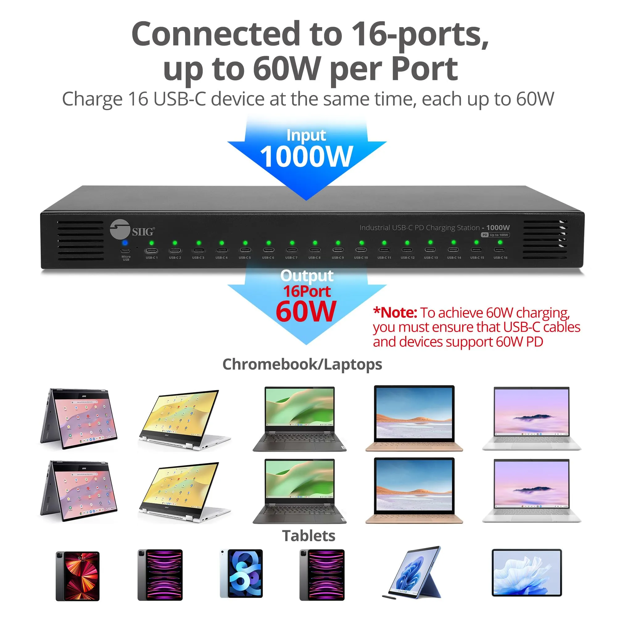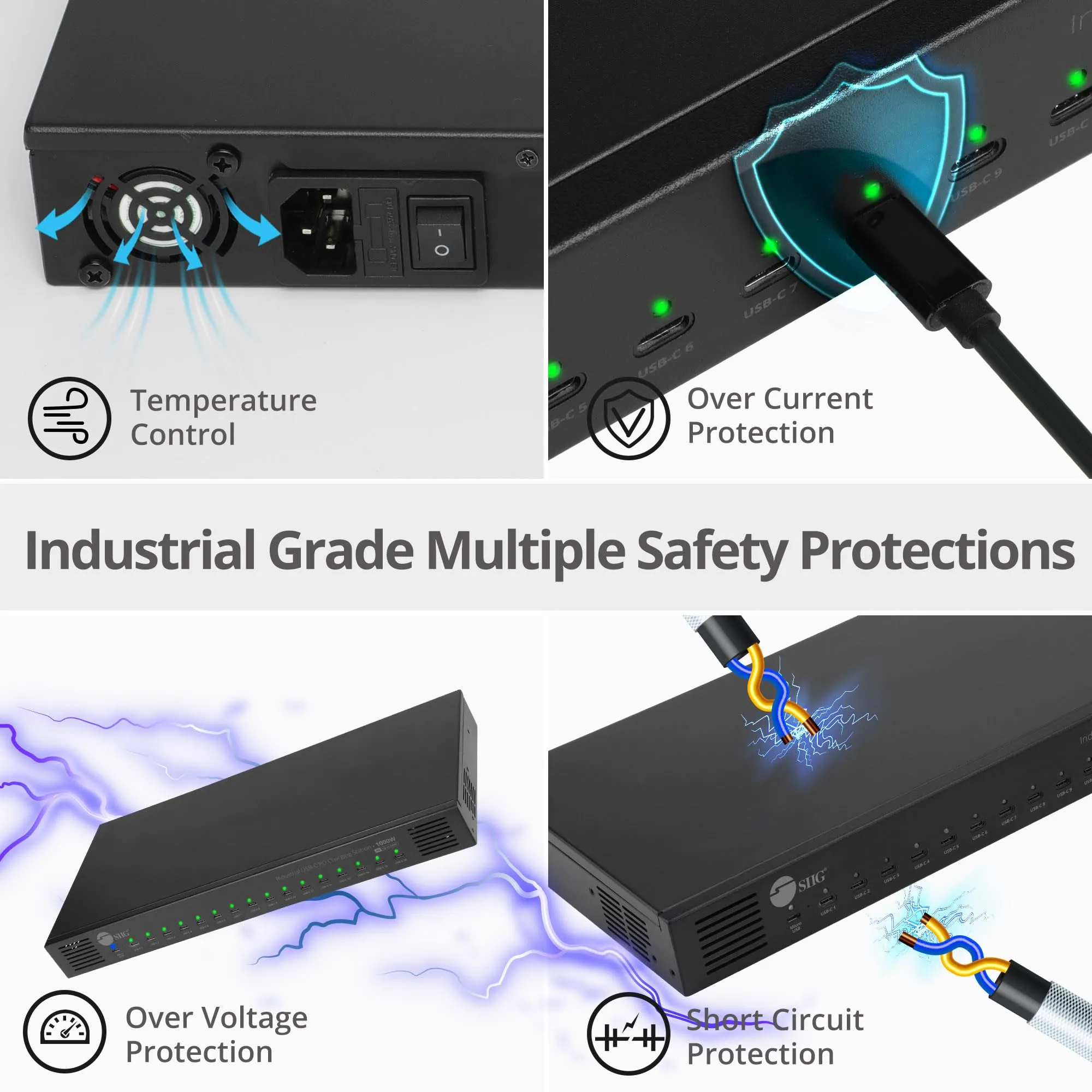 The SIIG 16-Port Industrial USB-C PD Charging Station is designed for efficient and reliable charging of multiple devices simultaneously. With a robust 1000W power output, it ensures fast and seamless charging for various USB-C enabled devices.
