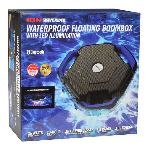 ullistrongIon Audio Wave Rider Waterproof Bluetooth SpeakerbrlilistrongGeneral FeaturesliColor BlueliliIP67 waterproofing and ruggedrubberized designit floatsliliLED lights illuminate the water with excitementlili26 watts of dynamic power energizes your musiclili2inch fullrange speakers deliver lifelike soundliliPassive radiator reinforces the bass for added lowendpunchliliStreams music wirelessly from any Bluetoothenabled deviceliliBluetooth track control playpause44 next44 backliliSensitive FM radio with presets plays your favoritestationslili35inch aux input for nonBluetooth devicesliliRechargeable battery provides hours of continuous use 20 hourbattery lifeliliKeep your phone dry by using Wave Riders builtin mic foranswering callsliliWorks with Siri and moreliliConnects wirelessly to additional Wave Rider speaker viaStereoLink sold separatelybrlistrongLight ModesliColor CycleliliRedWhiteBlueliliBeat SyncliliOffbrlistrongPortsliMicro USB 5V20Alili35mm Aux inbrlistrongDimensionsli882 x 949 x 299inches H x W x D