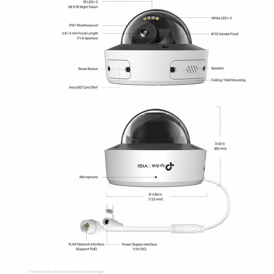 The VIGI 8MP Full-Color Dome Camera is designed for high-definition surveillance with exceptional clarity. This network camera features an 8MP resolution and a 2.8mm fixed lens, providing superior image quality in both day and night settings.