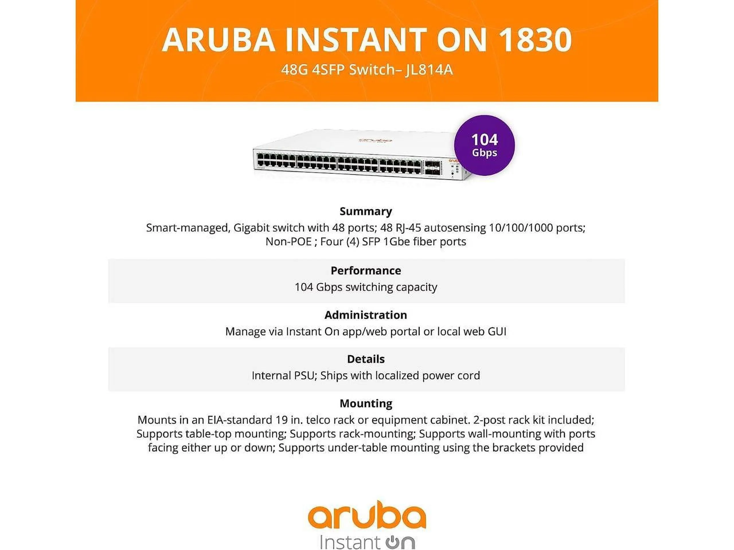 HPE Networking Instant On Switch Series 1830 48-Port Gb Smart-managed Layer 2 Ethernet Switch - 48x 1G - 4x SFP - Fan-less - US Cord (JL814A#ABA)