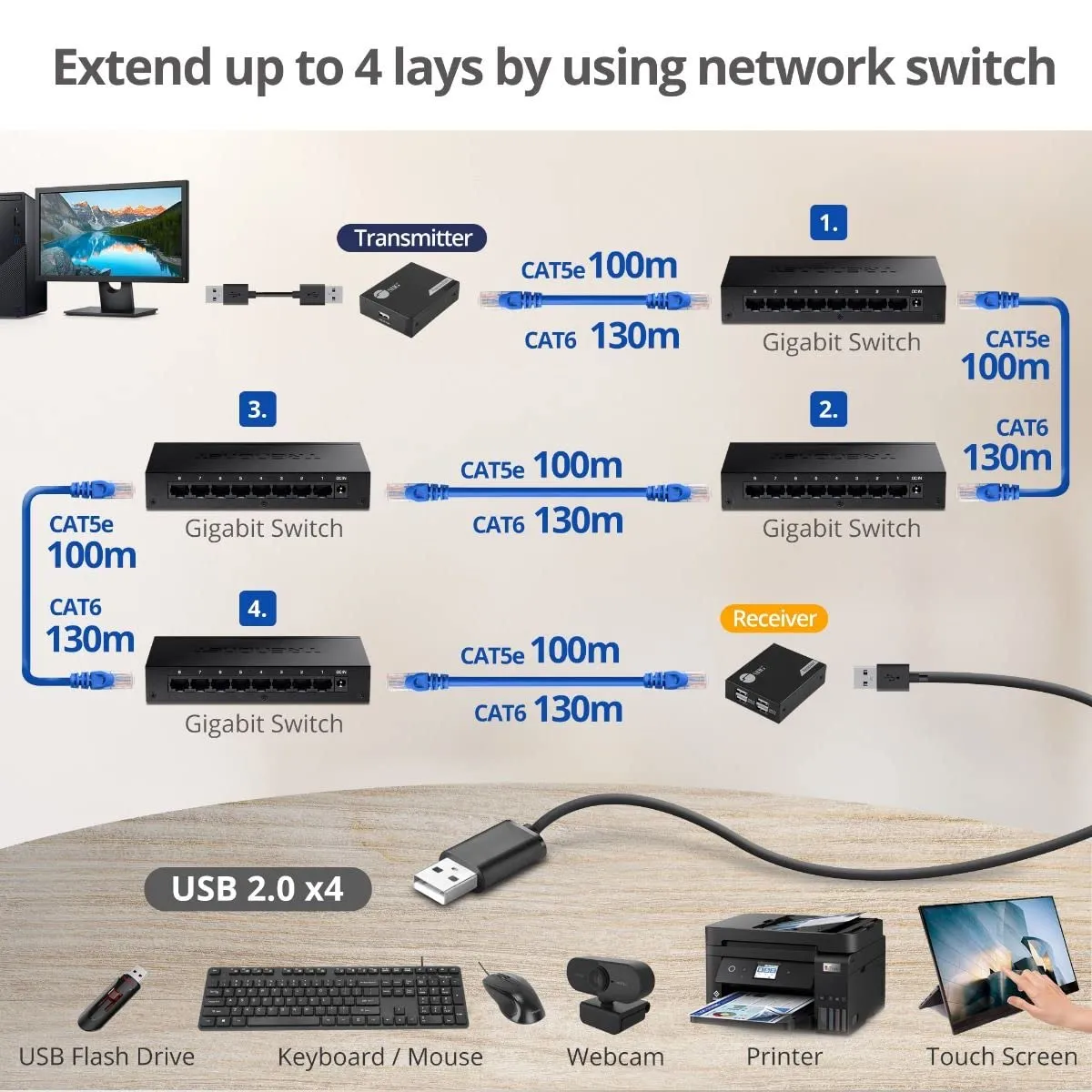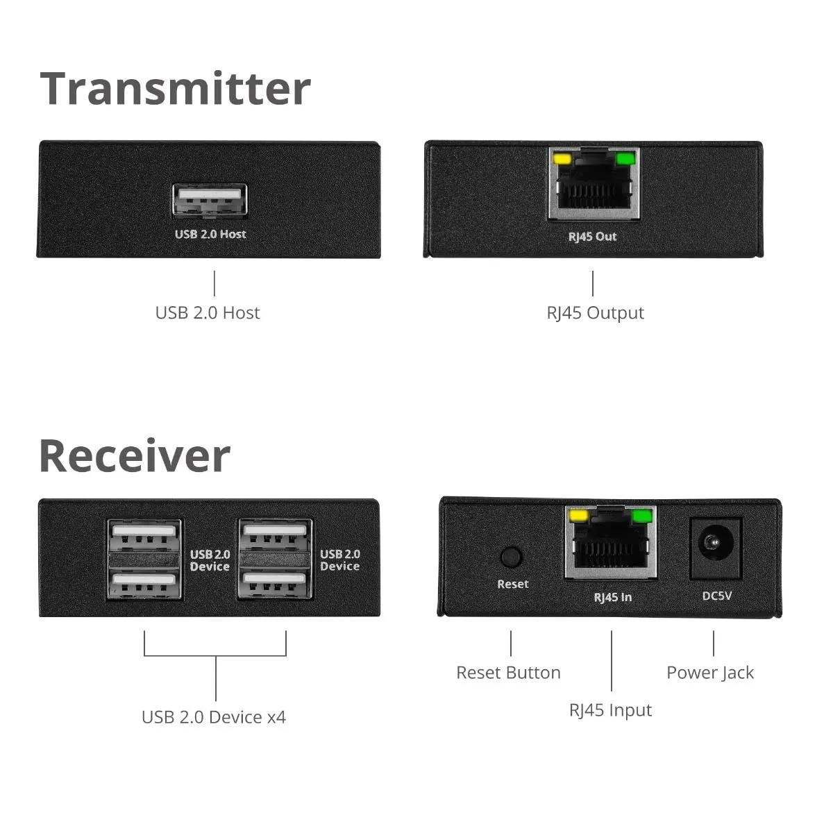 4-Port USB Extender, Extends USB 2.0 device connections up to 492 feet (150 meters) over single Cat6/7 cable, Metal Housing, Plug-and-Play
