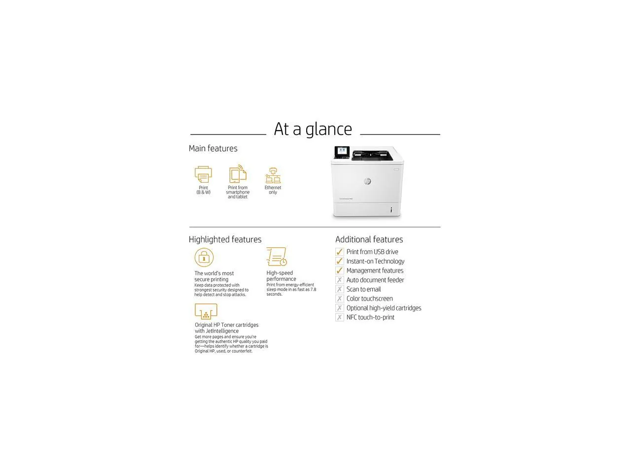 LaserJet printer with a 2.7" LCD combines exceptional performance and energy efficiency with professional-quality documents, all while protecting your network with top of the line security. With HP Sure Start, this printer regularly checks its operating code and repairs itself from attempted hacks to help prevent potential attacks. Runtime intrusion detection continually monitors to detect and stop attacks, then automatically reboots. Its fast start time wakes up quickly and prints your first page in as little as 5.3 seconds for time-saving performance. Centralize control of your printing environment with Web Jetadmin and help build business efficiency with confidence. Printer also features 512MB memory, 1.2 GHz processor speed, 100-sheet multipurpose feeder, 550-sheet input feeder, 500-sheet output bin and more.