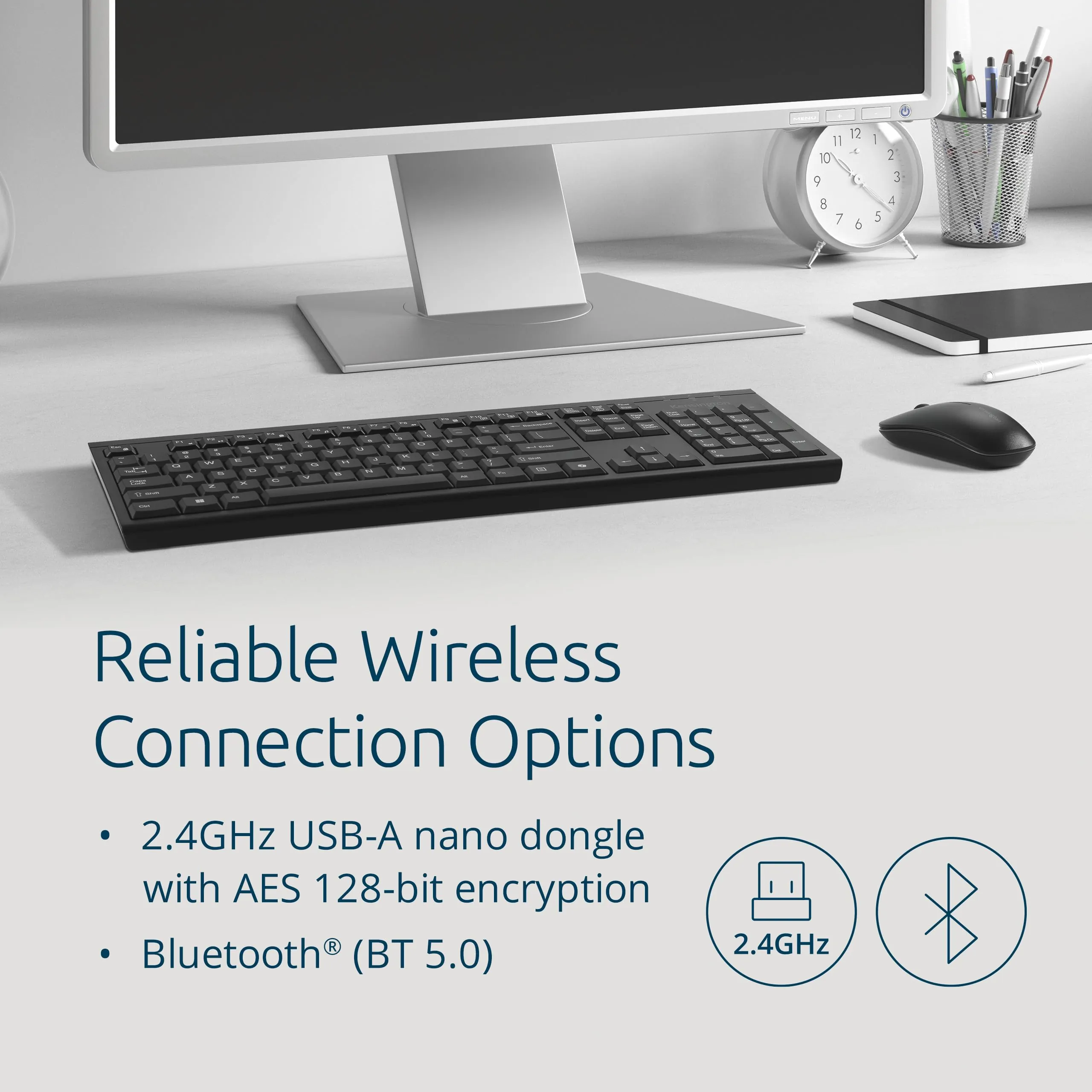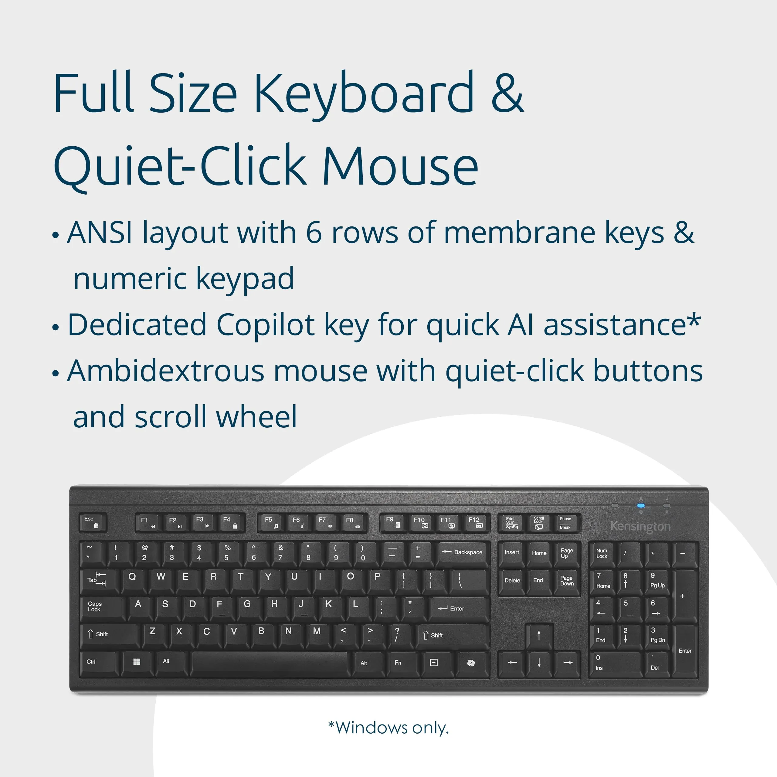 It features wireless 2.4GHz connectivity along with Bluetooth options, ensuring compatibility with both Windows and macOS systems. The full-size keyboard layout includes a dedicated Copilot key and a spill-proof design, making it a practical choice for everyday use. The accompanying mouse is designed for quiet clicks and is ambidextrous, catering to all users.