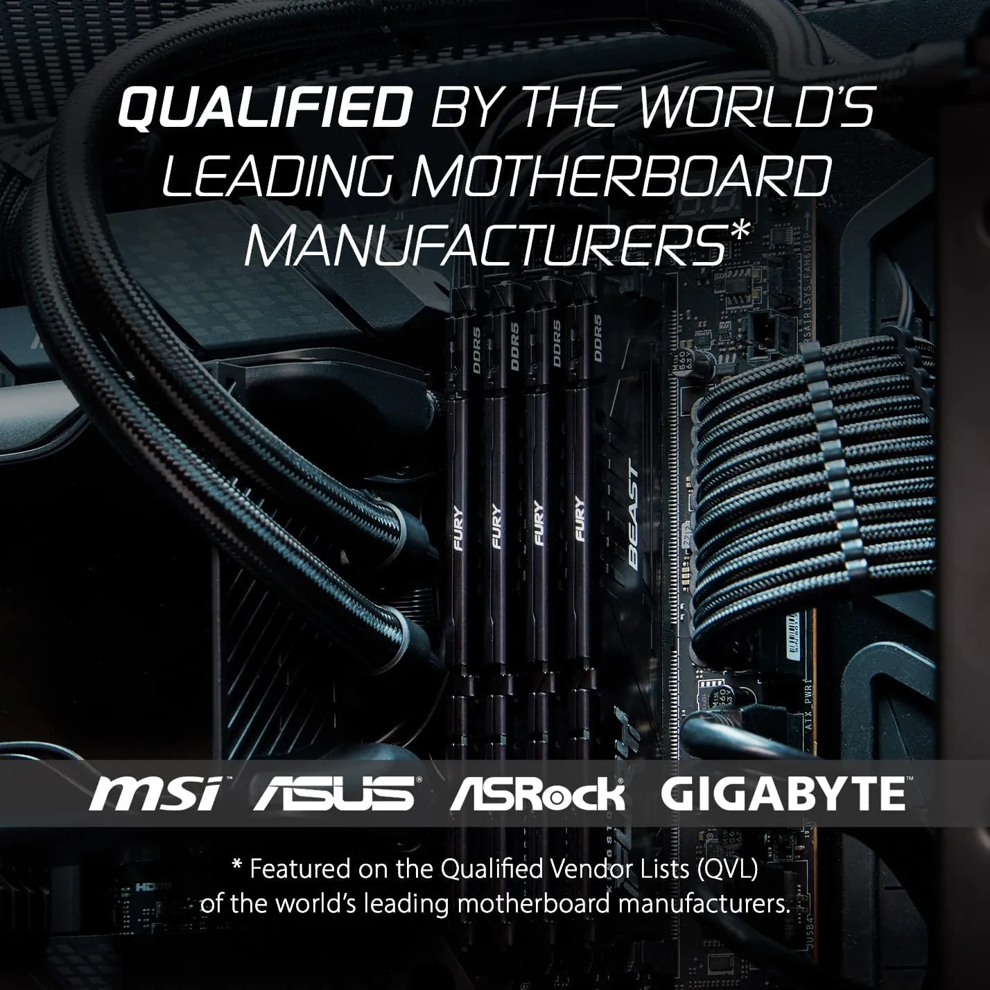 Kingston FURY Beast DDR5 memory brings the latest, cutting-edge technology for next-gen gaming platforms. Taking speed, capacity and reliability even further, DDR5 arrives with an arsenal of enhanced features, like on-die ECC (ODECC) for improved stability at extreme speeds, dual 32-bit subchannels for increased efficiency, and an on-module power management integrated circuit (PMIC) to provide juice where it’s needed most. Superior speed advancements with double the banks from 16 to 32 and double the burst length from 8 to 16, take DDR5 memory, your gaming experience and your overall system applications to the next-level of performance. Whether you’re pushing the limits in your gaming with the most extreme settings, live streaming at 4K+ or pushing large animation and 3D Rendering, Kingston FURY Beast DDR5 memory is the level up needed, while seamlessly bridging style and unleashing performance. Additionally, it utilizes Intel XMP 3.0, a new overclock spec that includes two customizable profiles for speeds and timings.
