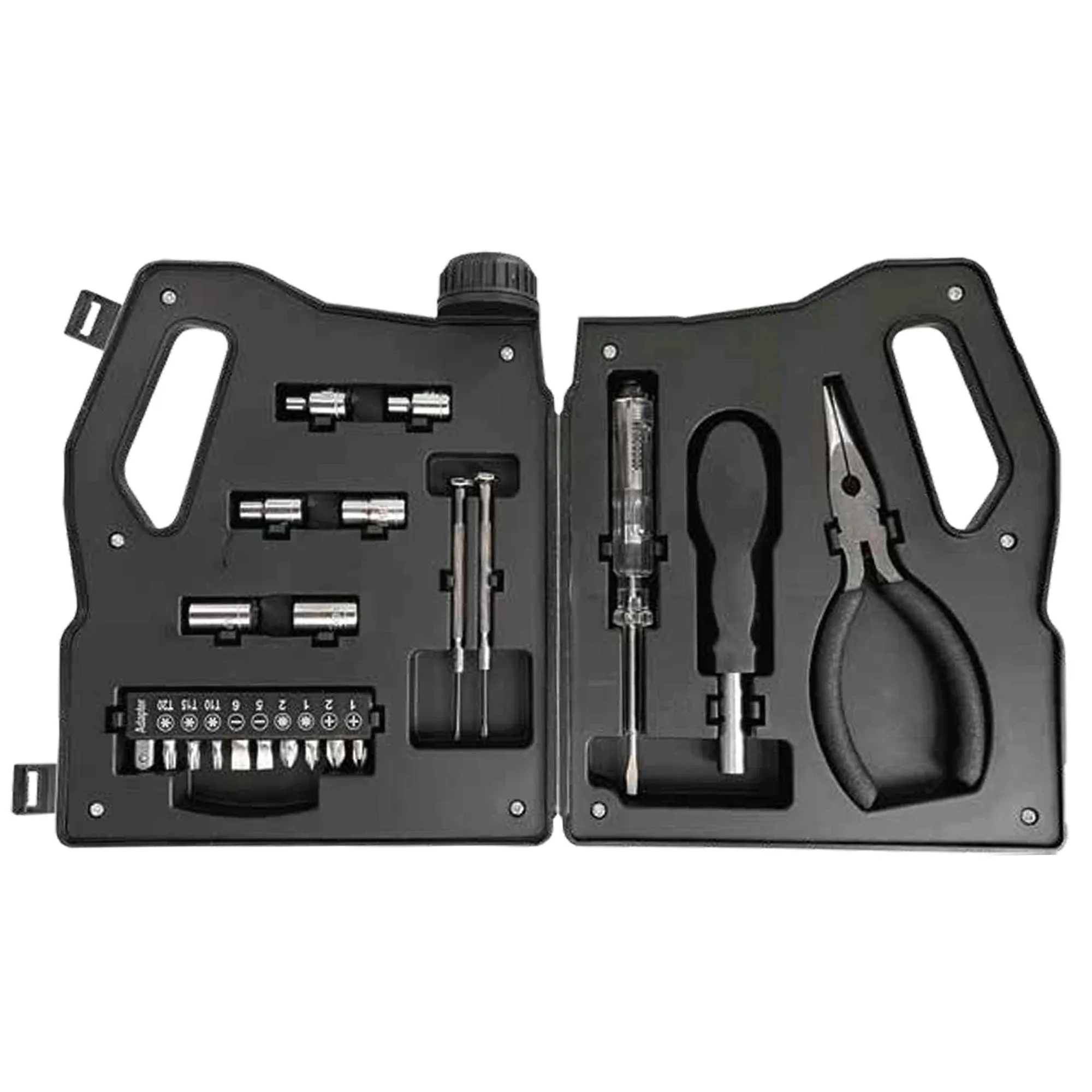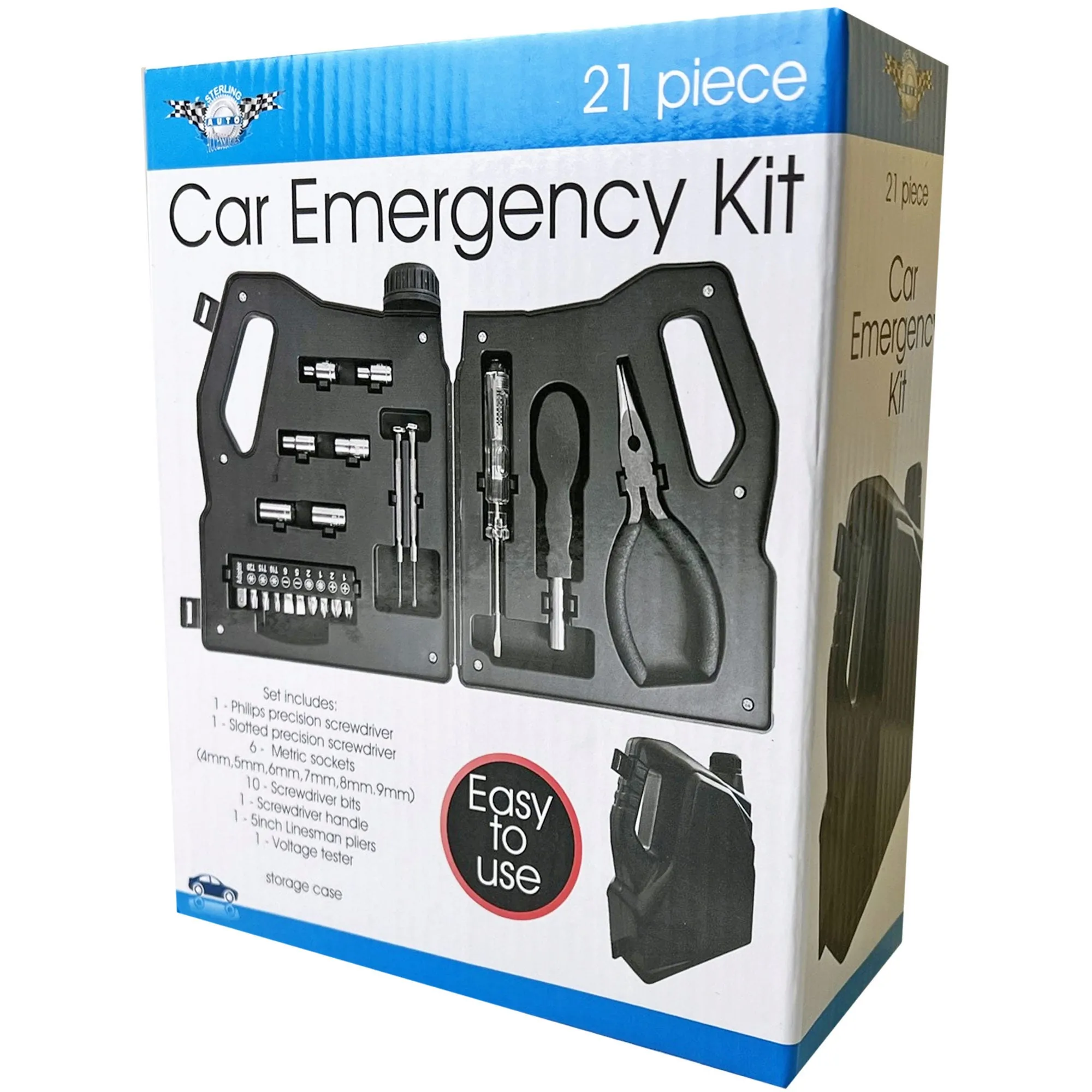 This convenient all-in-one 21 Piece Emergency Tool Kit is a car and garage must-have! Whether you're working in your home garage or find yourself in an emergency on the road, this auto tool set comes with a variety of tools. This set includes one Philips precision screwdriver, one slotter precision screwdriver, six metric sockets (4mm, 5mm, 6mm, 7mm, 8mm, 9mm), ten screwdriver bits, one screwdriver handle, one 5" linesman pliers, and one voltage tester all housed inside a plastic oil can shaped storage case. Tools are made with carbon steel. Measures approximately 6.5" x 7.9" x 3". Comes packaged inside a sturdy box,21 Piece Tools Kit in Oil Can,