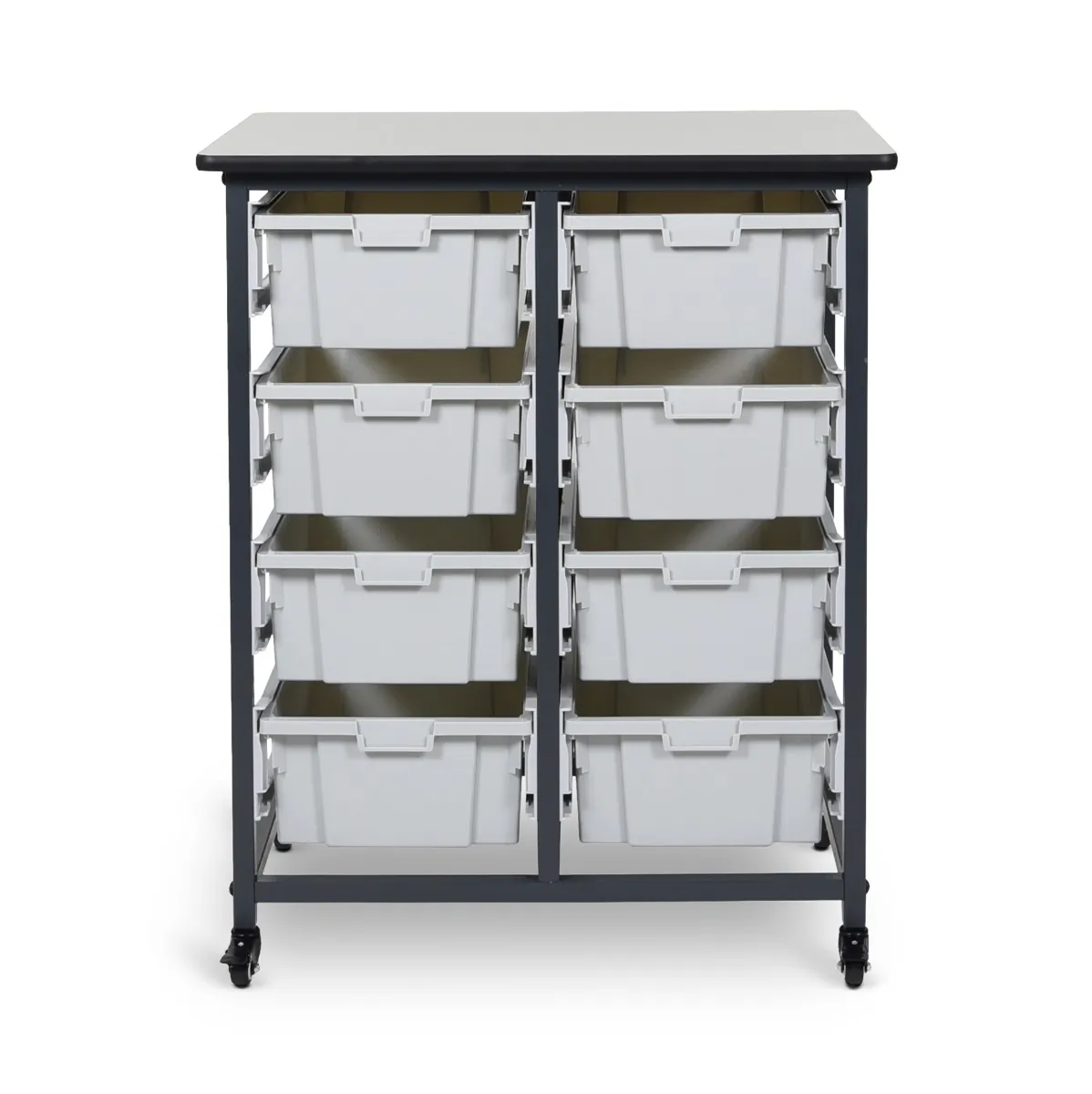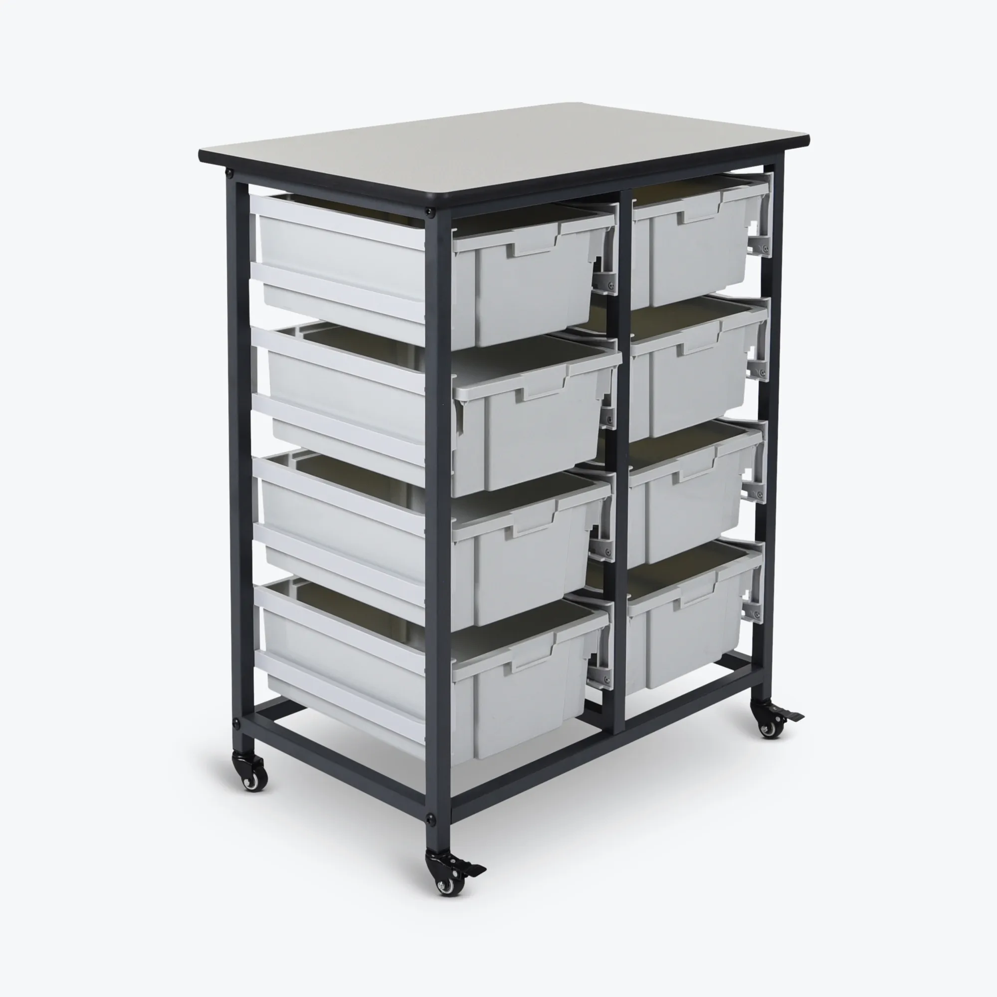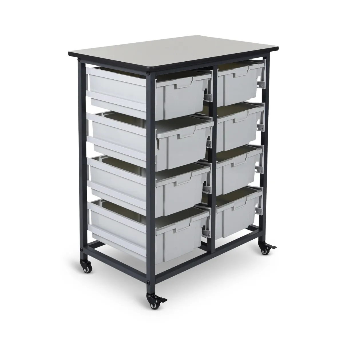 Organize your workspace with the Luxor Double Row Mobile Bin System, designed to offer convenient storage for daily essentials. Constructed with a robust steel frame and sturdy guide rails, this system securely holds eight 6" polypropylene tubs, each with a capacity of up to 20 lbs. It features an innovative safety mechanism to prevent bins from dislodging unintentionally. This versatile mobile rack is compatible with 3"-deep tubs (sold separately) and includes a flat-top surface for additional workspace or storage options.