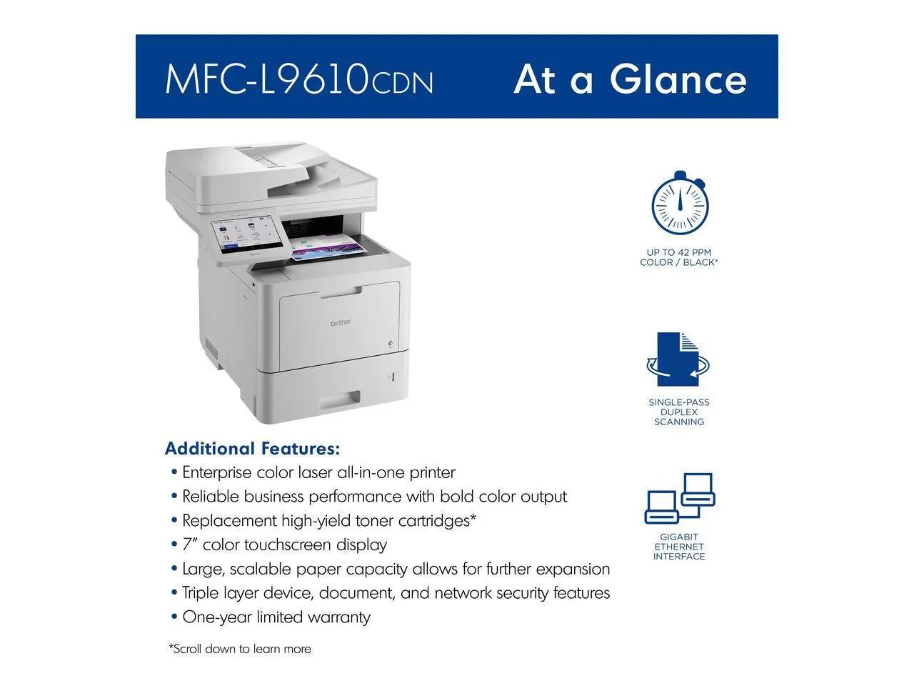 The Brother MFC-L9610CDN is a high-performance laser multifunction printer designed for busy offices. It offers exceptional color and monochrome printing capabilities, delivering fast print speeds of up to 42 pages per minute. This versatile printer features copying, faxing, and scanning functionalities, making it an all-in-one solution for your business needs.