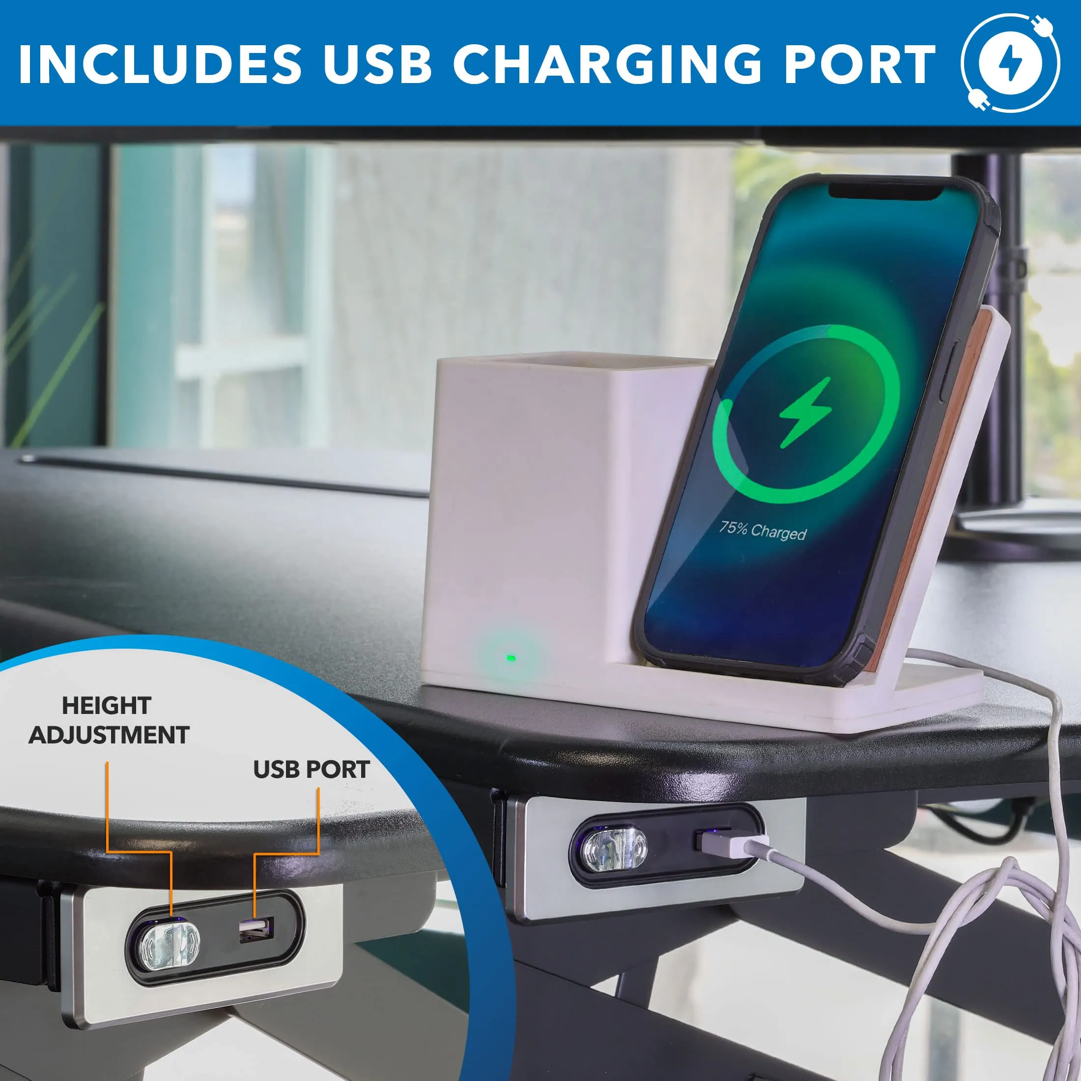 The spacious 47" x 23" top platform easily accommodates two monitors side by side, while the included dual monitor mount allows you to personalize the height and angle of your screens for comfortable viewing. Additionally, a built-in device slot and USB port make it easy to keep your smartphone or tablet within reach, perfect for multitasking and staying organized.