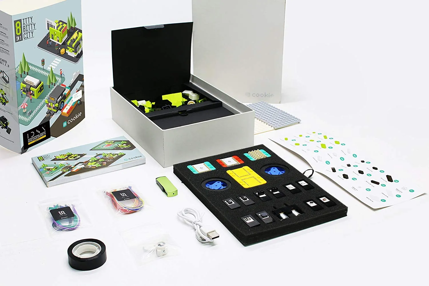 STEM Code Programmable Toy. An 8-in-1 city themed project kit that includes all required hardware/materials to create an Itty Bitty city. Includes building blocks, modules, sensors, and more.
