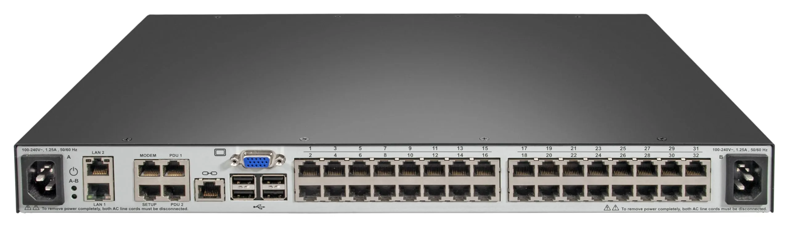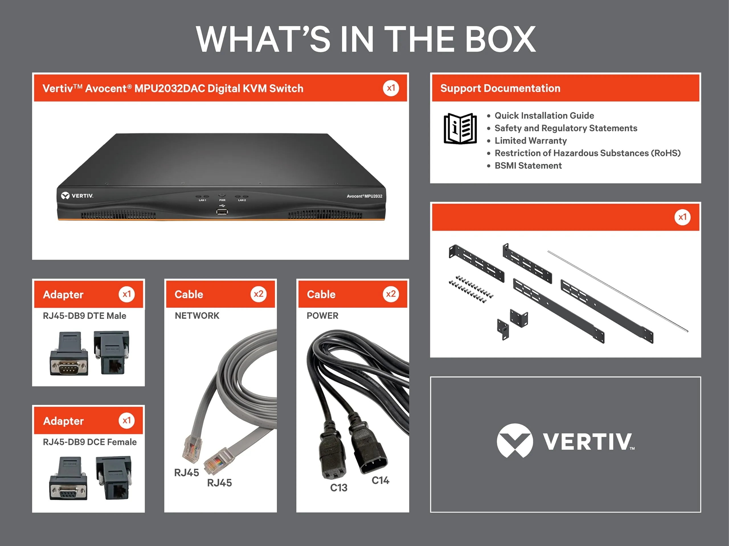 The Vertiv 32-Port Dual Path KVM Switch allows for seamless management of up to 32 servers from a single console. With 2 digital KVM paths, it supports dual AC power supplies, ensuring reliable operation. This switch is designed for environments requiring a TAA-compliant solution, making it suitable for federal and government applications.