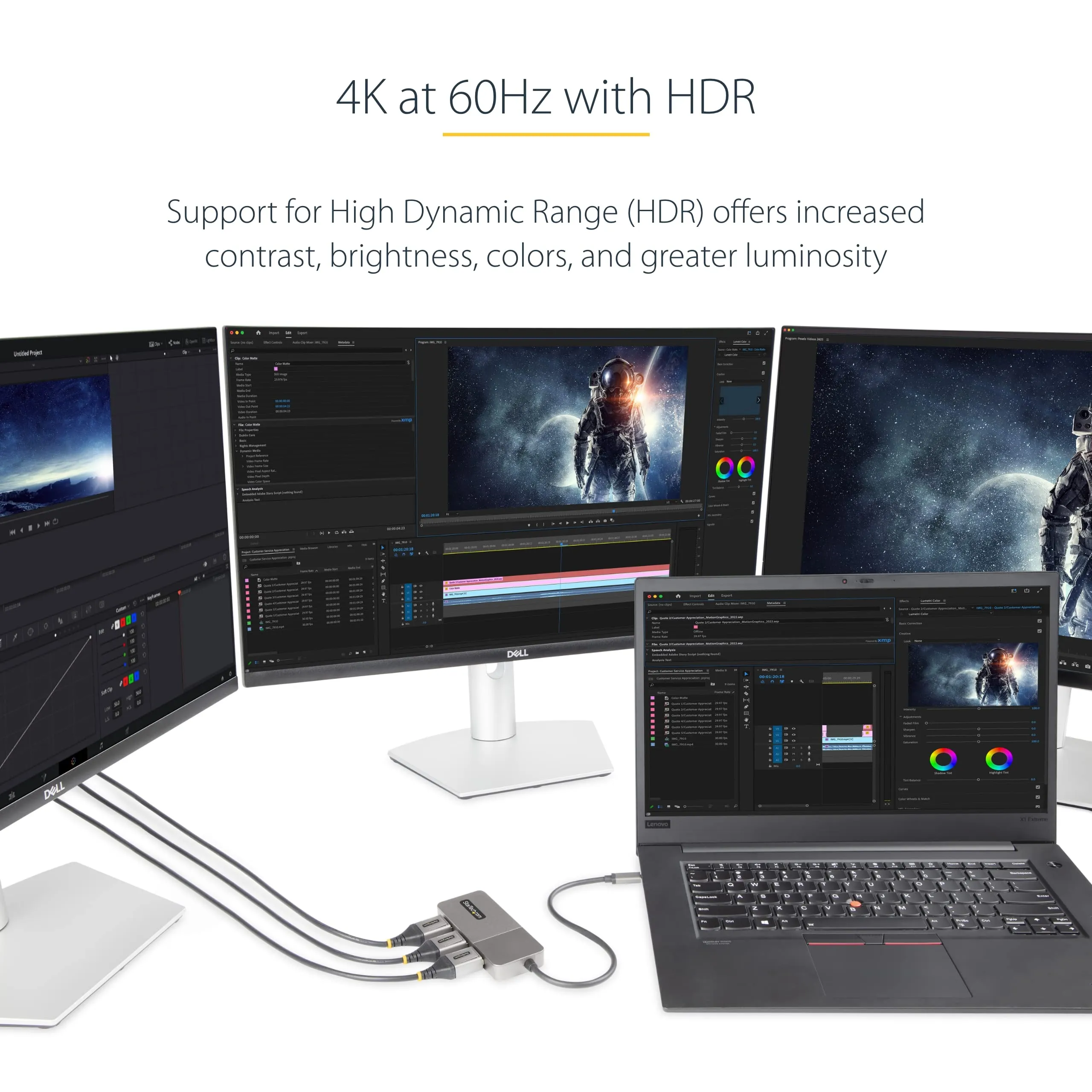 The StarTech USB-C to Triple DisplayPort 1.4 MST Hub allows you to connect up to three 4K monitors at 60Hz, providing an ultimate multi-display experience. With a built-in 1ft cable, this hub supports DisplayPort 1.4 technology, enabling high bandwidth signals up to 32.4Gbps, HDR support, and dual-channel audio. It's perfect for Windows laptops such as Lenovo, Dell, HP, and Surface devices.